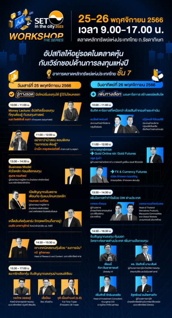 กรุงเทพฯ 25 พ.ย. – ตลาดหลักทรัพย์แห่งประเทศไทยจัดงาน SET in the City 2023 จัดเวิร์กชอปเพื่อให้ความรู้ด้านการลงทุนแก่นักลงทุนมือใหม่ รวมถึงอัปสกิลนักลงทุนที่มีประสบการณ์ งานจัดระหว่างวันเสาร์ที่ 25 ถึงวันอาทิตย์ที่ 26 พฤศจิกายน 2566 เวลา 9.00-17.00 น. ที่ตลาดหลักทรัพย์แห่งประเทศไทย