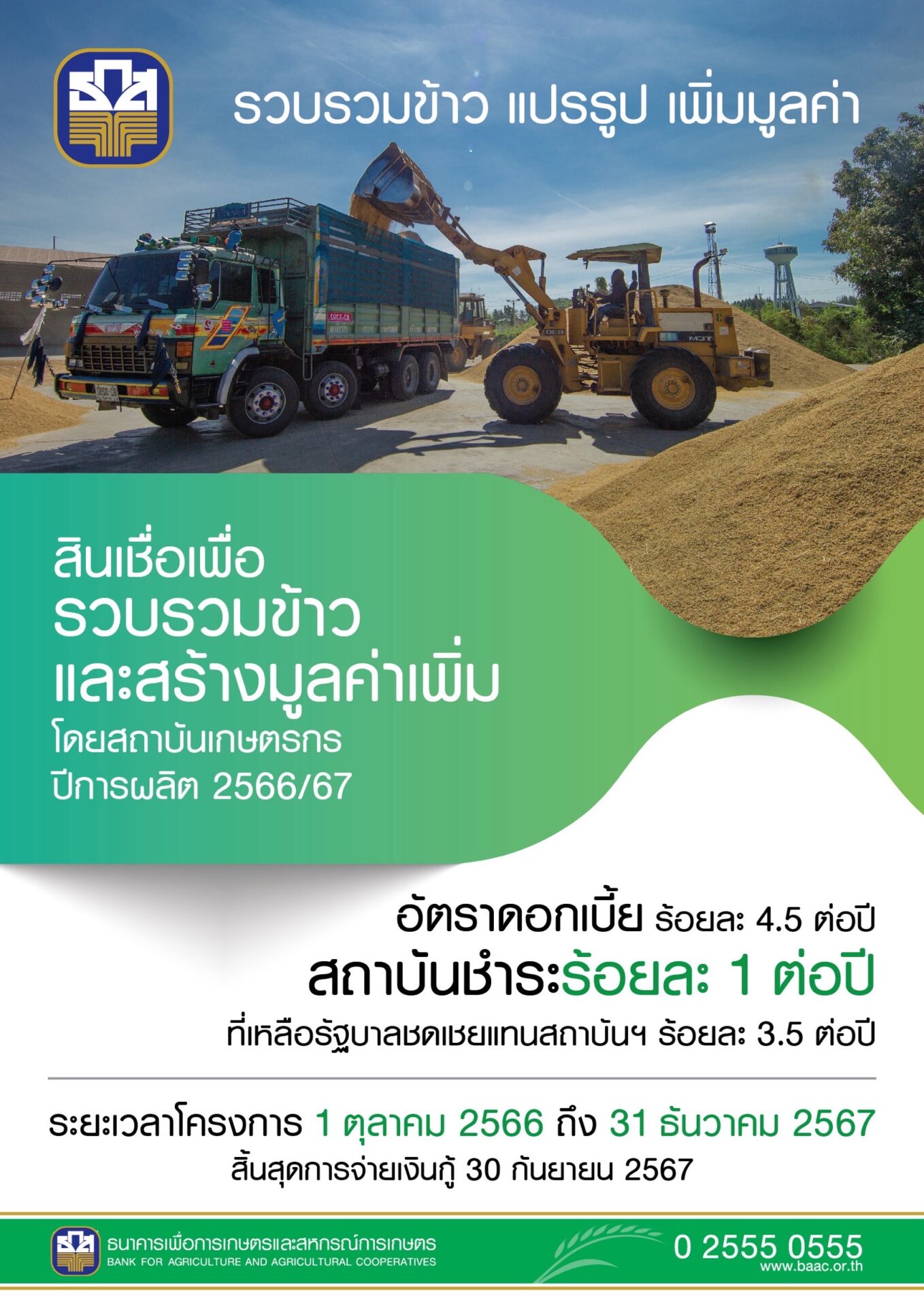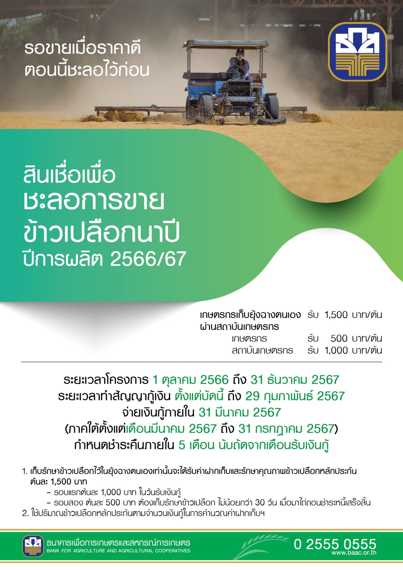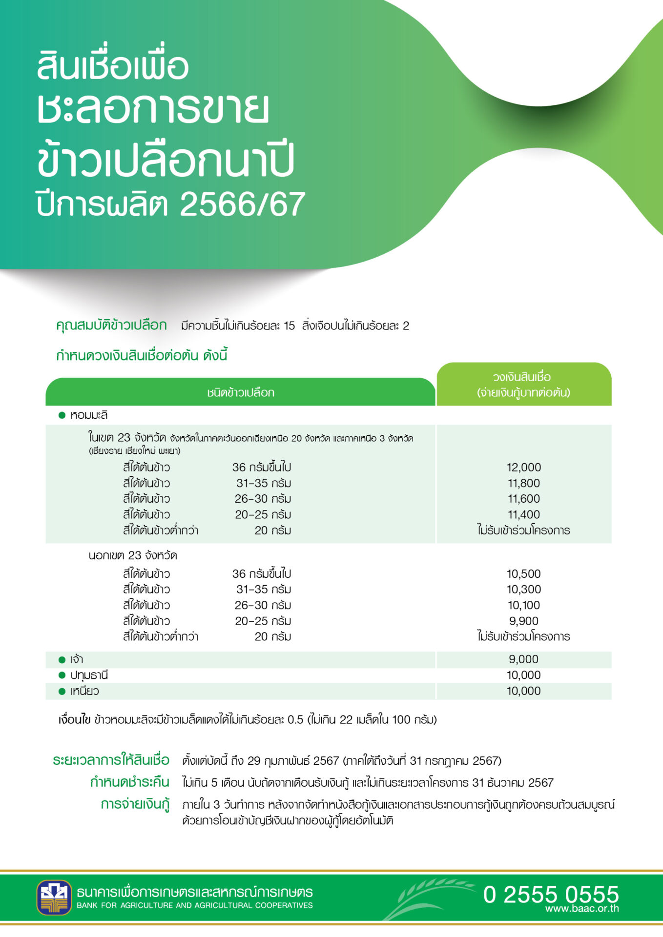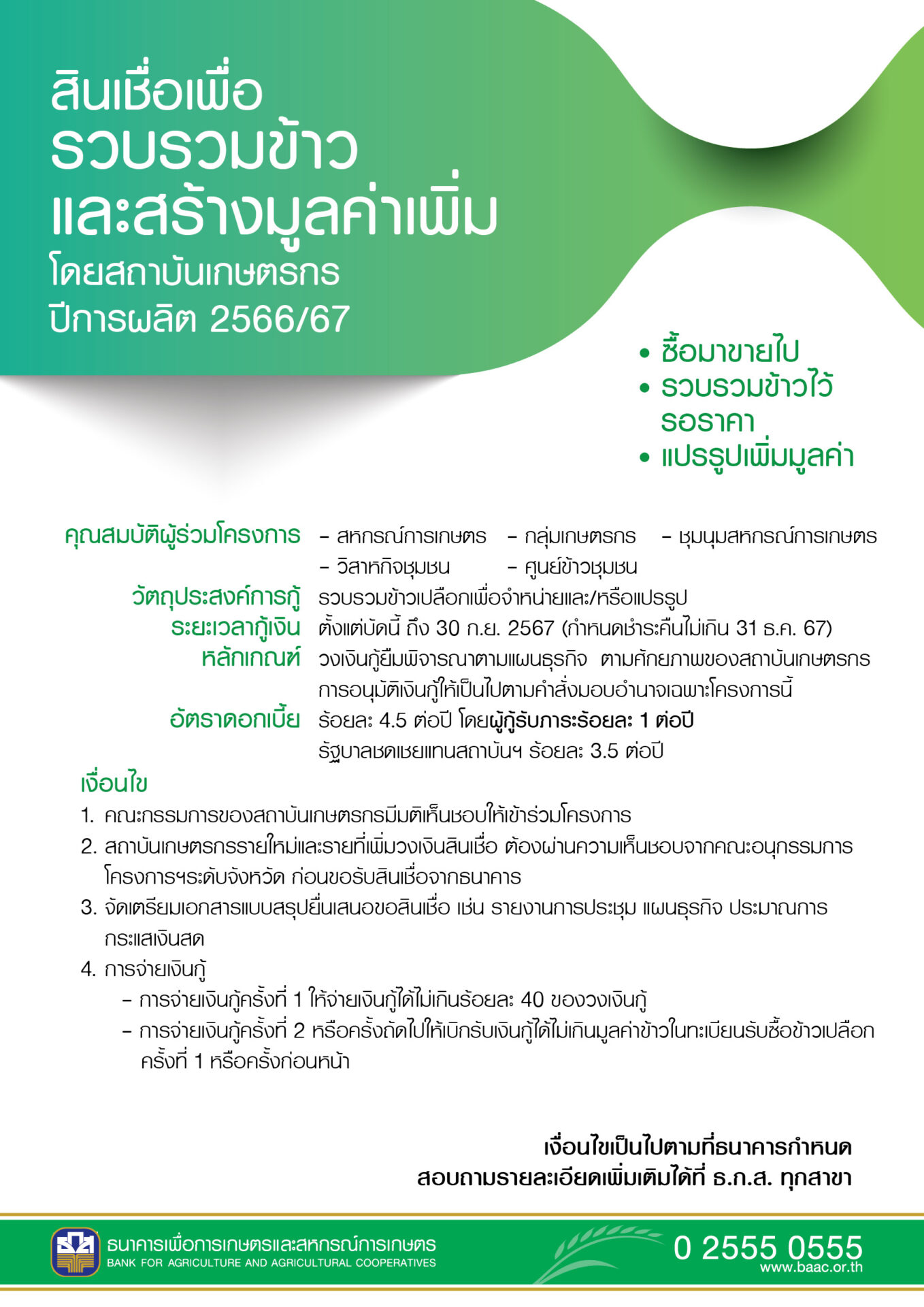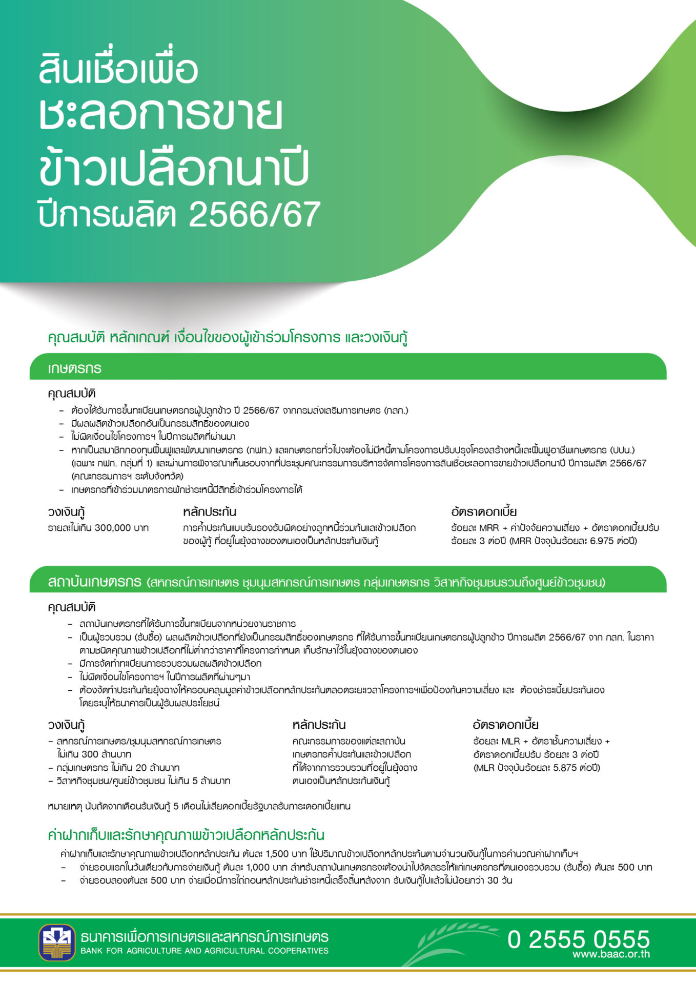 และ 2) สินเชื่อเพื่อรวบรวมข้าวและสร้างมูลค่าเพิ่มโดยสถาบันเกษตรกร ปีการผลิต 2566/67 วงเงินรวม 10,000 ล้านบาท เป้าหมายรวบรวมปริมาณข้าวเปลือก 1 ล้านตัน โดยสหกรณ์การเกษตร ชุมนุมสหกรณ์การเกษตร กลุ่มเกษตรกร วิสาหกิจชุมชนและศูนย์ข้าวชุมชนที่ประกอบธุรกิจรวบรวมข้าวจากเกษตรกรสมาชิก และเกษตรกรทั่วไป ซึ่งมีคุณสมบัติตามที่กำหนด สามารถขอสนับสนุนสินเชื่อ ดังนี้ สหกรณ์การเกษตร/ชุมนุมสหกรณ์การเกษตร แห่งละไม่เกิน 300 ล้านบาท กลุ่มเกษตรกร แห่งละไม่เกิน 20 ล้านบาท และวิสาหกิจชุมชนและศูนย์ข้าวชุมชน แห่งละไม่เกิน 5 ล้านบาท ซึ่งสถาบันฯ ชำระดอกเบี้ยเพียงร้อยละ 1 ต่อปี ส่วนที่เหลือรัฐบาลรับภาระชำระแทน ระยะเวลาจ่ายสินเชื่อตั้งแต่บัดนี้จนถึง 30 กันยายน 2567 สอบถามรายละเอียดเพิ่มเติมได้ที่ ธ.ก.ส. ทุกสาขาทั่วประเทศ หรือ Call Center 02 555 0555