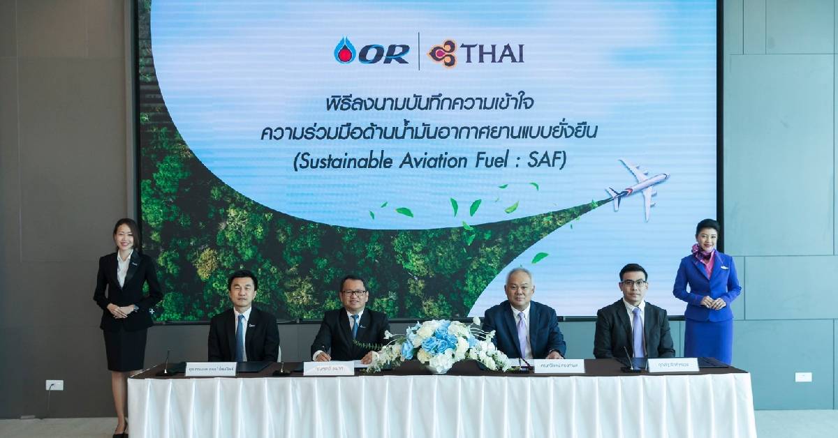 นายสุชาติ ระมาศ ผู้อำนวยการใหญ่ บริษัท ปตท.น้ำมันและการค้าปลีก จำกัด (มหาชน) หรือ OR พร้อมด้วยนายทวิโรจน์ ทรงกำพล ประธานเจ้าหน้าที่สายกลยุทธ์องค์กร บริษัท การบินไทย จำกัด (มหาชน) ร่วมลงนามบันทึกความเข้าใจ (MOU) เรื่อง การใช้น้ำมันเชื้อเพลิงอากาศยานแบบยั่งยืน (SAF) สำหรับเที่ยวบินนำร่อง และความร่วมมือในอนาคตระหว่าง บริษัท ปตท.น้ำมันและการค้าปลีก จำกัด (มหาชน) และ บริษัท การบินไทย จำกัด (มหาชน)
