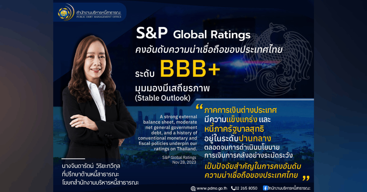 นางจินดารัตน์ วิริยะทวีกุล ที่ปรึกษาด้านหนี้สาธารณะ โฆษกสำนักงานบริหารหนี้สาธารณะ เปิดเผยว่า บริษัท S&P Global Ratings (S&P) ได้คงอันดับความน่าเชื่อถือของประเทศไทยที่ BBB+ และคงมุมมองความน่าเชื่อถือของประเทศไทย (Outlook) ในระดับมีเสถียรภาพ (Stable Outlook) เนื่องจากคาดว่า เศรษฐกิจไทยจะฟื้นตัว และเติบโตอย่างรวดเร็วจากร้อยละ 2.5 ในปี 2566 เป็นร้อยละ 4.2 ในปี 2567 เนื่องจากมาตรการทางการคลังและการฟื้นตัวของภาคการท่องเที่ยว อีกทั้ง Real GDP Growth เติบโตเฉลี่ยร้อยละ 3.2 ในช่วงปี 2566 – 2569 การขาดดุลงบประมาณต่อ GDP เฉลี่ยต่ำกว่าร้อยละ 4 ในช่วงปี 2567 – 2569