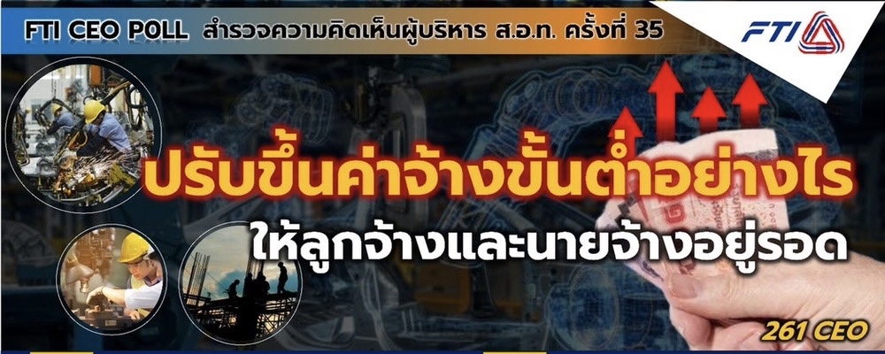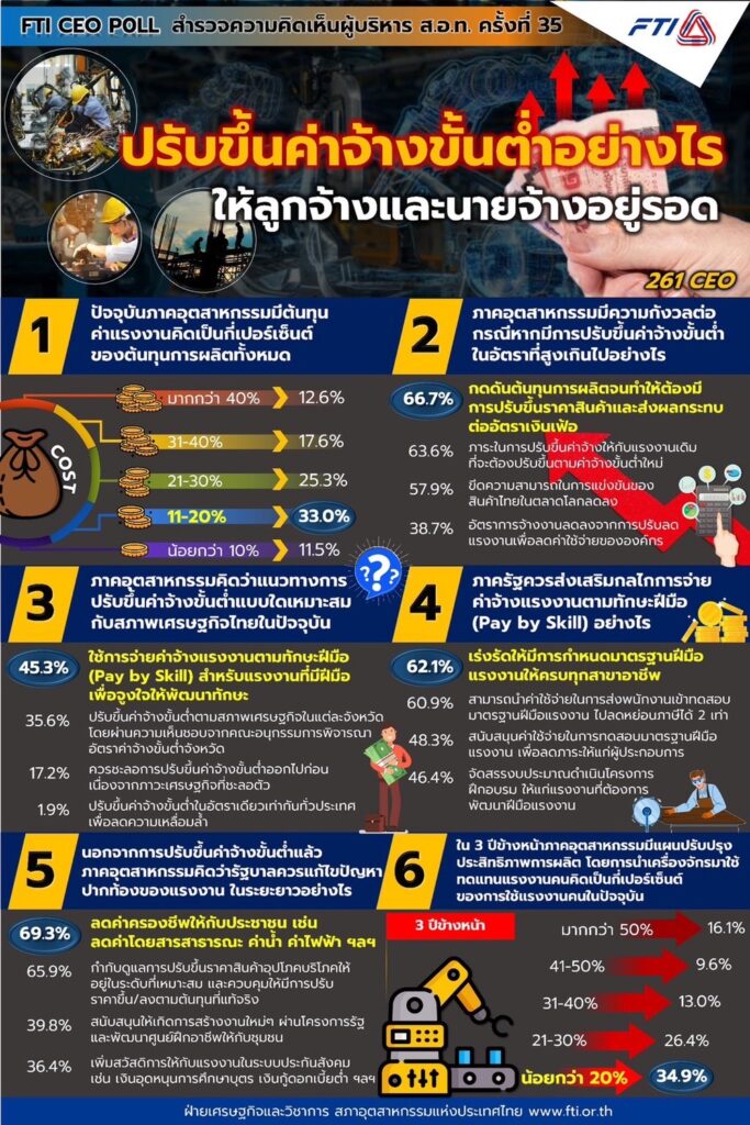 สภาอุตสาหกรรมแห่งประเทศไทย (ส.อ.ท.) เปิดเผยผลสำรวจ FTI Poll ครั้งที่ 35 ในเดือน พ.ย.66 ภายใต้หัวข้อ “ปรับขึ้นค่าจ้างขั้นต่ำอย่างไรให้ลูกจ้างและนายจ้างอยู่รอด” จากการสำรวจผู้บริหาร ส.อ.ท. (CEO Survey) จำนวน 256 ราย ครอบคลุมผู้บริหารจาก46 กลุ่มอุตสาหกรรม และ 76 สภาอุตสาหกรรมจังหวัด