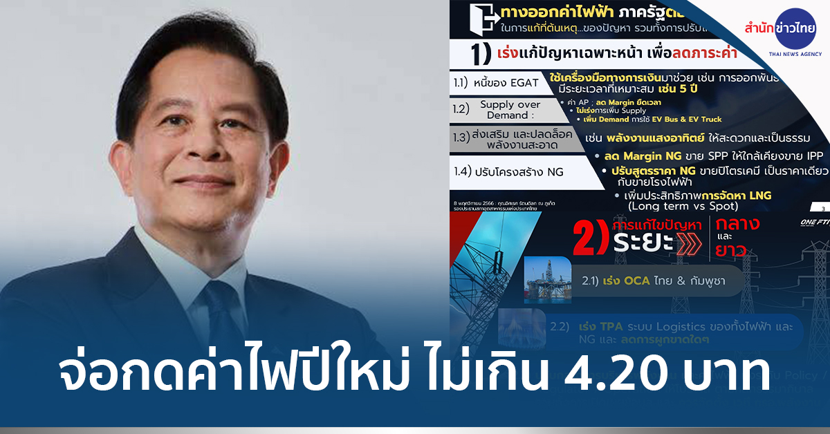 รมว.พลังงาน กำชับคณะทำงาน กกพ. ได้หาแนวทางลดภาระค่าไฟประชาชน ไม่ให้เจอแรงปะทะหลังปีใหม่ โดยจัดการราคาไว้ให้อยู่ที่ 4 บาทต้น ๆ และจะพยายามทำตัวเลขให้ลดลงได้มากที่สุด ซึ่งราคาใกล้เคียงความเป็นจริงที่กระทรวงจัดการได้ ราวๆ 4.20 บาท/หน่วย โดยใช้กลไกจัดการผสมผสาน หลายขั้นตอนกว่าการลดราคาค่าไฟปกติทั่วไป ไม่ได้ใช้แค่เรื่องประวิงหนี้การไฟฟ้าฝ่ายฟลิตแห่งประเทศไทย (กฟผ.) อย่างเดียว ทั้งนี้ ขอย้ำว่านี่คือการบริหารลดค่าครองชีพระยะสั้นให้ประชาชนเท่านั้น ทางกระทรวงพลังงานยังยืนยันการแก้ไขเชิงโครงสร้าง ก๊าซธรรมชาติ ต้นตอของปัญหาราคาไฟฟ้า และสนับสนุนพลังงานไฟฟ้าสะอาดระยาวต่อไป