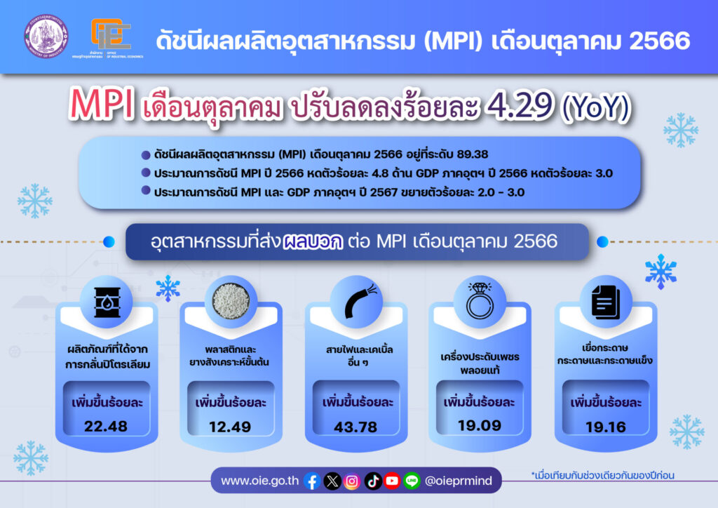 นางศิริเพ็ญ เกียรติเฟื่องฟู รองผู้อำนวยการสำนักงานเศรษฐกิจอุตสาหกรรม (สศอ.) กระทรวงอุตสาหกรรม เปิดเผยว่า ดัชนีผลผลิตอุตสาหกรรม (MPI) เดือนตุลาคม ปี 2566 อยู่ที่ระดับ 89.38 หดตัวร้อยละ 4.29 เมื่อเทียบกับช่วงเดียวกันของปีก่อน ส่งผลให้ 10 เดือนแรกของปี 2566 หดตัวร้อยละ 5.04 ด้านอัตราการใช้กำลังการผลิตเดือนตุลาคมอยู่ที่ร้อยละ 56.83 และ 10 เดือนแรกเฉลี่ยร้อยละ 59.53