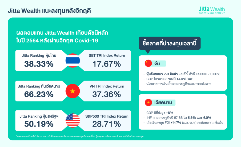 อย่างไรก็ตาม Jitta Wealth แนะนำว่านักลงทุนควรคว้าโอกาสลงทุนจากตลาดที่ยังมีโอกาสในการเติบโต แต่กำลังเผชิญวิกฤติจนดัชนีปรับตัวลดลงมามากอย่างตลาดหุ้นจีนและเวียดนาม เพื่อรับโอกาสการเติบโตในอนาคตที่ตลาดจะกลับฟื้นตัวได้ดีใน 1-2 ปีข้างหน้า หากผ่านพ้นวิกฤติไปแล้ว ส่วนตลาดหุ้นสหรัฐฯ ในปีนี้ปรับตัวเพิ่มขึ้นมามากแล้ว ดังนั้นโอกาสที่จะปรับตัวเพิ่มขึ้นอาจจะไม่มากแล้ว