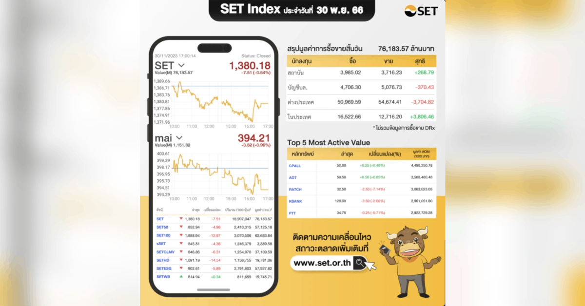 ตลาดหลักทรัพย์แห่งประเทศไทย (ตลท.) เปิดเผยว่า ในวันนี้ (30 พ.ย.) มูลค่าซื้อขายรวม 77,335.39 ล้านบาท โดยเป็นผู้ลงทุนต่างชาติราว 53,003 ล้านบาท (68.54%) และผู้ลงทุนในประเทศ 15,571 ล้านบาท (20.13%) ซึ่งเป็นวันที่มีการทำ MSCI Rebalancing และการปรับสัดส่วนการถือครองหุ้นโดยต่างชาติ ทั้งนี้มีมูลค่าการซื้อขายจาก Program Trading 41,034.85 ล้านบาท (53%)