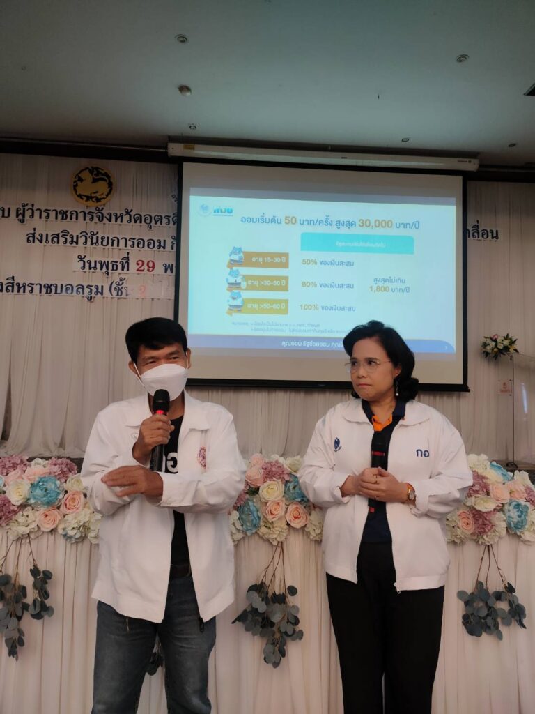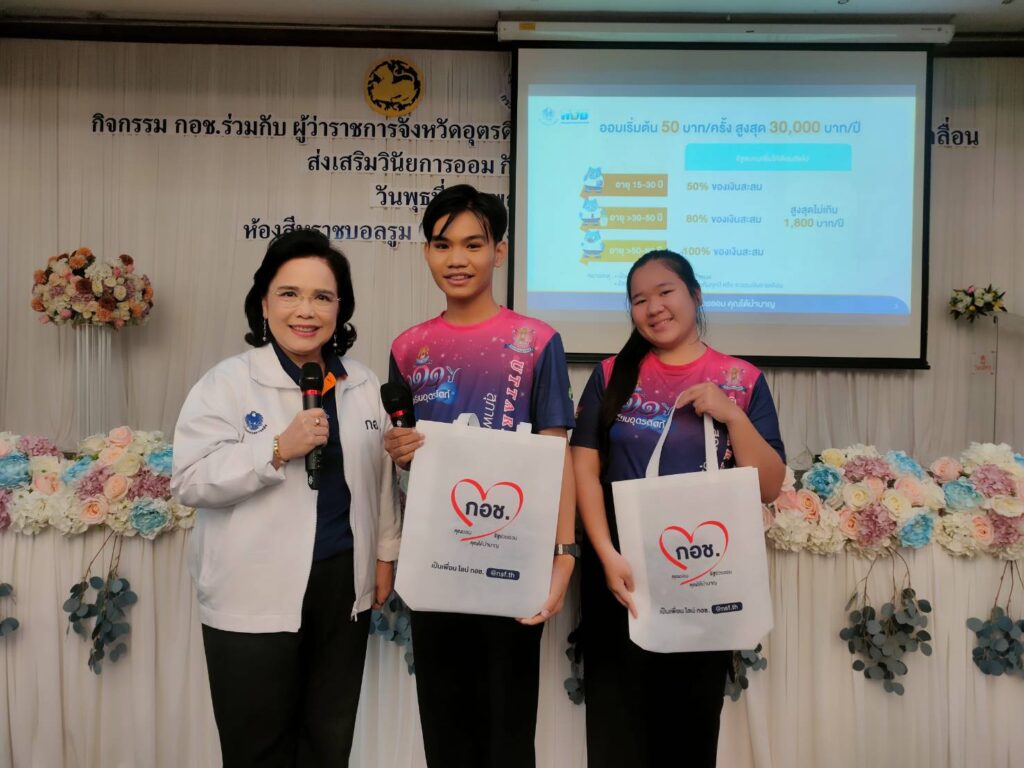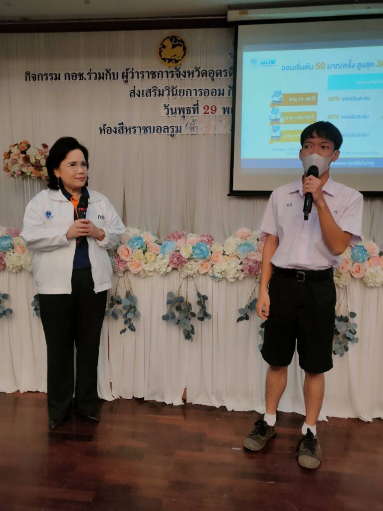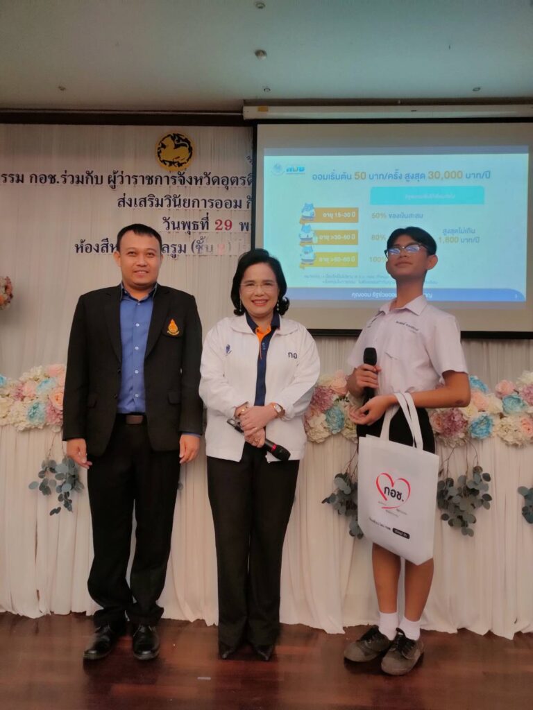 1 ธ.ค. – กอช. เดินหน้าขับเคลื่อนส่งเสริมวินัยการออมกับ กอช. ในกลุ่มนักเรียน อายุ 15 ปีขึ้นไป และประชาชนอาชีพอิสระ จังหวัดอุตรดิตถ์ ออมเงินกับ กอช. เพื่ออนาคต