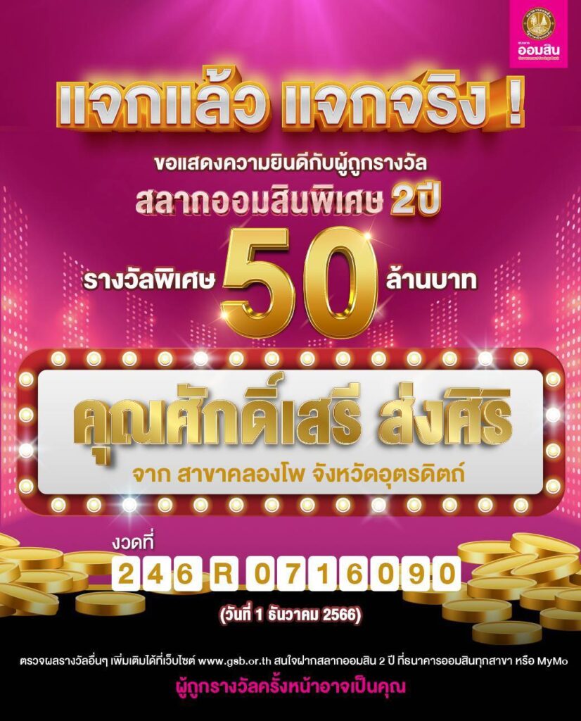 นายวิทัย รัตนากร ผู้อำนวยการธนาคารออมสิน เปิดเผยว่า วันนี้ (1 ธ.ค.2566) ธนาคารได้ออกรางวัลสลากออมสินพิเศษ 2 ปี ภายใต้แคมเปญแจกรางวัล รวม 80 ล้านบาท ให้กับผู้ฝากตั้งแต่วันที่ 21 ก.ย. – 30 พ.ย.66 เป็นรางวัลพิเศษมูลค่า 50 ล้านบาท 1 รางวัล ซึ่งธนาคารขอแสดงความยินดีกับผู้โชคดี นายศักดิ์เสรี ส่งศิริ ลูกค้าสาขาคลองโพ จ.อุตรดิตถ์ ผู้ถือสลากออมสินพิเศษงวดที่ 246 หมวดอักษร R หมายเลขสลาก 0716090 เป็นลูกค้าที่ชอบเก็บออมเงินด้วยการฝากสลากออมสินพิเศษมาอย่างยาวนานสม่ำเสมอตั้งแต่วัยเด็ก เคยถูกรางวัลเล็กน้อย ครั้งนี้ถือเป็นการถูกรางวัลใหญ่ครั้งแรกในชีวิต โดยวันที่ 15 ธันวาคม 2566 ผู้ถูกรางวัลพิเศษให้เกียรติเดินทางร่วมพิธีมอบเงินรางวัลที่ธนาคารออมสินสำนักงานใหญ่ ด้วยตนเอง ส่วนรางวัลที่ 1 มูลค่าเงินรางวัล 30 ล้านบาท ธนาคารขอแสดงความยินดีกับลูกค้าผู้ถือสลากออมสินพิเศษ งวดที่ 240 หมวด ช หมายเลขสลาก 3805583