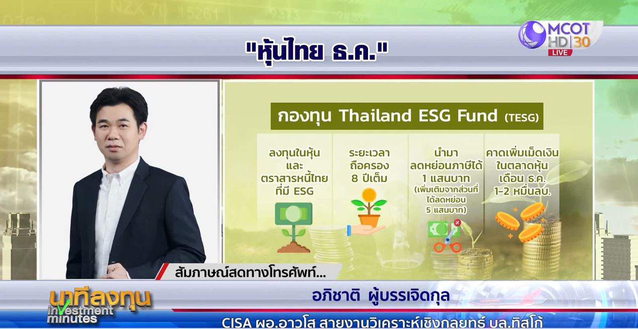 4 ธ.ค. – 16 บลจ. จะเริ่มเปิดขายกองทุน TESG พร้อมกัน คาดมีเงินไหลเข้าในตลาดกว่า 1 หมื่นล้านบาท จะเข้ามาสร้างความคึกคัก หุ้นน่าสนใจคือหุ้นบลูชิพขนาดใหญ่ . – สำนักข่าวไทย