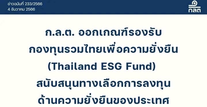สำนักงานคณะกรรมการกำกับหลักทรัพย์และตลาดหลักทรัพย์ (ก.ล.ต.) ออกประกาศหลักเกณฑ์เกี่ยวกับการจัดตั้งและจัดการกองทุนรวมไทยเพื่อความยั่งยืน (Thailand ESG Fund) หรือ Thai ESG ที่มีนโยบายการลงทุนในทรัพย์สินที่มีความโดดเด่นด้านความยั่งยืนหรือสิ่งแวดล้อมและผู้ออกทรัพย์สินเป็นภาครัฐหรือกิจการที่จัดตั้งขึ้นตามกฎหมายไทย โดยมีผลใช้บังคับตั้งแต่วันที่ 1 ธันวาคม 2566 เป็นต้นไป ตามมติคณะรัฐมนตรี เมื่อวันที่ 21 พฤศจิกายน 2566 ที่เห็นชอบมาตรการภาษีเพื่อส่งเสริมการลงทุนเพื่อความยั่งยืนของประเทศไทย ตามที่กระทรวงการคลังเสนอ