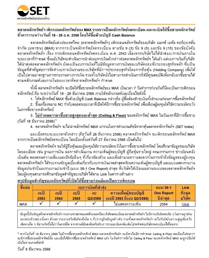 ทั้งนี้ ตลท.จะปลดเครื่องหมาย SP ชั่วคราวสำหรับหุ้น MAX ระหว่างวันที่ 18-26 ธ.ค.66 เพื่อเปิดโอกาสให้ผู้ลงทุนซื้อขายหลักทรัพย์ชั่วคราวก่อนถูกเพิกถอน โดยไม่กำหนดราคาซื้อขายสูงสุดและต่ำสุด (Ceiling & Floor) ของหุ้น MAX ในวันแรกที่มีการซื้อขาย แต่หากไม่มีการซื้อขาย ตลท.ก็จะยังคงไม่มีการกำหนด Ceiling & Floor ต่อเนื่องไปจนกว่าจะมีการซื้อขายหุ้น จากนั้นในวันทำการถัดไป Ceiling & Floor ของหลักทรัพย์ MAX จะถูกปรับให้เป็นไปตามเกณฑ์ปกติ ตลท.จะไม่นำหลักทรัพย์ MAX มารวมในการคำนวณดัชนีราคาหุ้นตลาดหลักทรัพย์ฯ (SET Index) ดังนั้น ขอให้ผู้ถือหุ้นและผู้ลงทุนใช้ความระมัดระวังในการซื้อขายหุ้น MAX โดยศึกษาข้อมูลของบริษัทโดยละเอียด เช่น ฐานะการเงิน ผลการดำเนินงาน ความเห็นผู้สอบบัญชี ผู้ถือหุ้นรายใหญ่ คณะกรรมการ ข่าวย้อนหลัง เป็นต้น ตลอดจนความเสี่ยงและปัจจัยอื่นๆ ที่เกี่ยวข้องด้วย