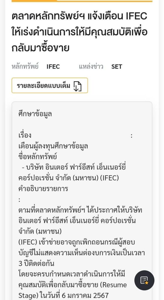 ตลาดหลักทรัพย์แห่งประเทศไทย แจ้งตือนผู้ลงทุนศึกษาข้อมูลหลักทรัพย์ บมจ.อินเตอร์ ฟาร์อีสท์ เอ็นเนอร์ยี่ คอร์ปอเรชั่น (IFEC) จากที่ตลาดหลักทรัพย์ฯ ได้ประกาศให้ IFEC เข้าข่ายอาจถูกเพิกถอนกรณีผู้สอบบัญชีไม่แสดงความเห็นต่องบการเงินเป็นเวลา 3 ปี ติดต่อกันโดยจะครบกำหนดเวลาดำเนินการให้มีคุณสมบัติเพื่อกลับมาซื้อขาย (Resume Stage) ในวันที่ 6 มกราคม 2567 เนื่องจากใกล้ครบกำหนดเวลาดังกล่าวแล้ว ตลาดหลักทรัพย์ฯ จึงขอแจ้งให้ IFEC เร่งดำเนินการให้มีคุณสมบัติเพื่อกลับมาซื้อขายได้ หาก IFEC ยังไม่สามารถดำเนินการได้ภายในระยะเวลาที่กำหนด ตลาดหลักทรัพย์ฯ จะเสนอคณะกรรมการตลาดหลักทรัพย์ฯ เพื่อพิจารณาดำเนินการต่อไป นอกจากนี้ IFEC ยังคงมีเหตุเข้าข่ายอาจถูกเพิกถอนอีก 1 เหตุกรณีส่วนของผู้ถือหุ้นมีค่าน้อยกว่าศูนย์ (จะครบกำหนดเวลาการแก้ไขเหตุเพิกถอนในวันที่ 18 เมษายน 2567)