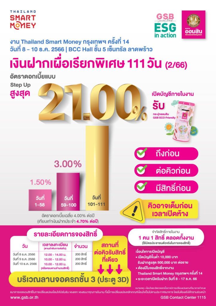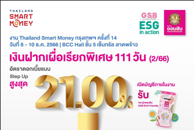 ธนาคารออมสิน เข้าร่วมงาน Thailand Smart Money กรุงเทพฯ ครั้งที่ 14 จัดโปรโมชันน่าสนใจเข้าร่วมในงานนี้ ทั้งผลิตภัณฑ์เงินฝากส่งเสริมการออมสำหรับทุกวัย สินเชื่อบ้าน สินเชื่อบุคคล และสินเชื่อรักษ์โลก โดยผลิตภัณฑ์เงินฝากไฮไลท์ ได้แก่ เงินฝากเผื่อเรียกพิเศษ 111 วัน ระยะเวลาฝาก 111 วัน ดอกเบี้ย Step up สูงสุด 21.00% ต่อปี คิดเป็นอัตราดอกเบี้ยเฉลี่ย 4.00% ต่อปี ได้รับยกเว้นภาษี รับฝากเฉพาะบุคคลธรรมดา จำนวน 600 สิทธิ์ เปิดจองสิทธิ์ภายในงานเท่านั้น และ สลากออมสินพิเศษ 2 ปี จัดแคมเปญรอบใหม่ต่อเนื่อง ด้วยการเพิ่มรางวัลพิเศษมูลค่า 50 ล้านบาท 1 รางวัล และยังมีสิทธิ์ถูกรางวัลที่ 1 อีก 30 ล้านบาท รวมเงินรางวัลใหญ่ 80 ล้านบาท สำหรับผู้ฝากทั้งแบบใบสลากและดิจิทัล เริ่มฝากตั้งแต่บัดนี้เป็นต้นไป ถึงวันที่ 31 ม.ค. 2567 กำหนดจับรางวัลวันที่ 1 ก.พ. 2567