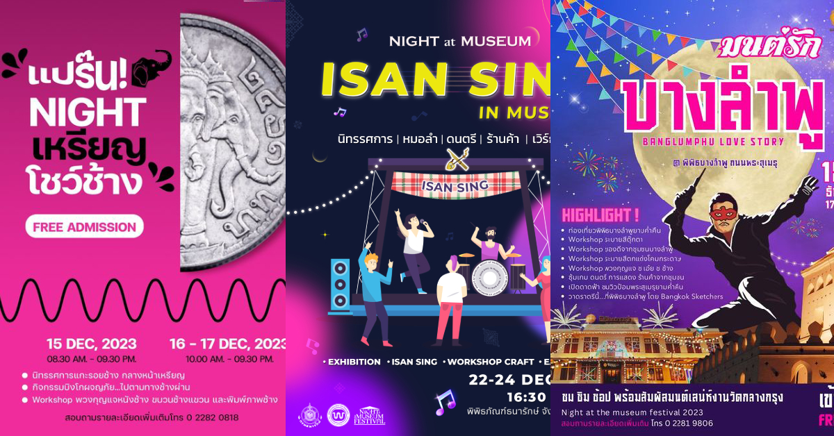 พิพิธบางลำพู ภายใต้ชื่องาน “มนต์รัก บางลำพู (Banglamphu Love Story)” ในวันที่ 15-17 ธันวาคม 2566 เวลา 17.00-21.00 น. พบกับกิจกรรม 1.ยลพิพิธภัณฑ์ยามค่ำคืน 2.Creative Workshop ระบายสีปูนปลาสเตอร์ และโคมไฟอาร์ทเพนท์ 3.Game Zone โยนห่วงมหาสนุก วงล้อหรรษา พาทัวร์ย่านบางลำพู และจับคู่ลุ้น Luck พร้อมด้วยกิจกรรมพิเศษ Colorful Lighting Installation
