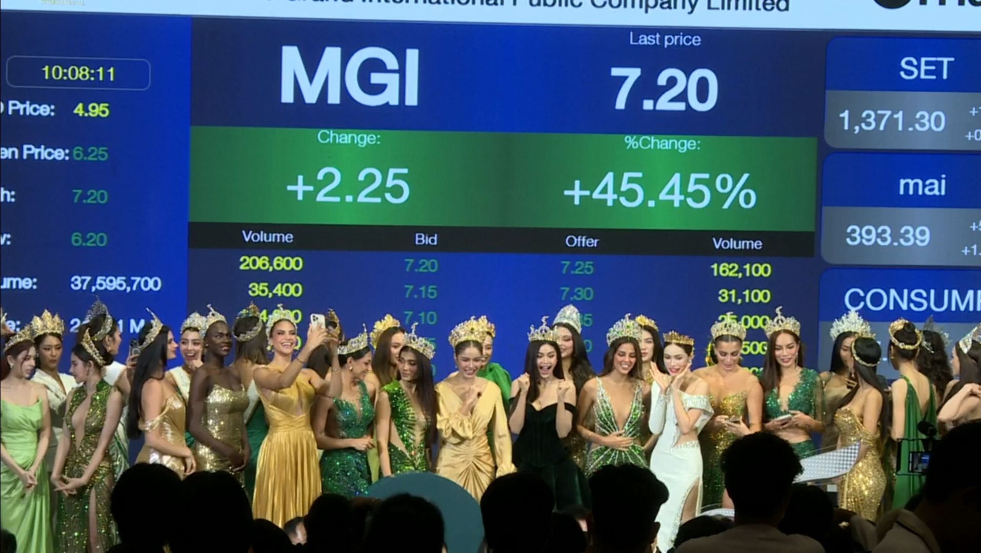 บมจ.มิสแกรนด์ อินเตอร์เนชั่นแนล เข้าซื้อขายในตลาดหลักทรัพย์ เอ็ม เอ ไอ วันนี้ (14 ธ.ค.) ด้วยมูลค่าหลักทรัพย์ ณ ราคา IPO 1,039.50 ล้านบาท โดยใช้ชื่อย่อในการซื้อขายหลักทรัพย์ว่า “MGI” ราคาหุ้นละ 4.95 บาท คิดเป็นมูลค่าระดมทุน 297 ล้านบาท เปิดเทรดวันแรกที่ 6.25 บาท เพิ่มขึ้น 1.30 บาท หรือเพิ่มขึ้น 26.26.%