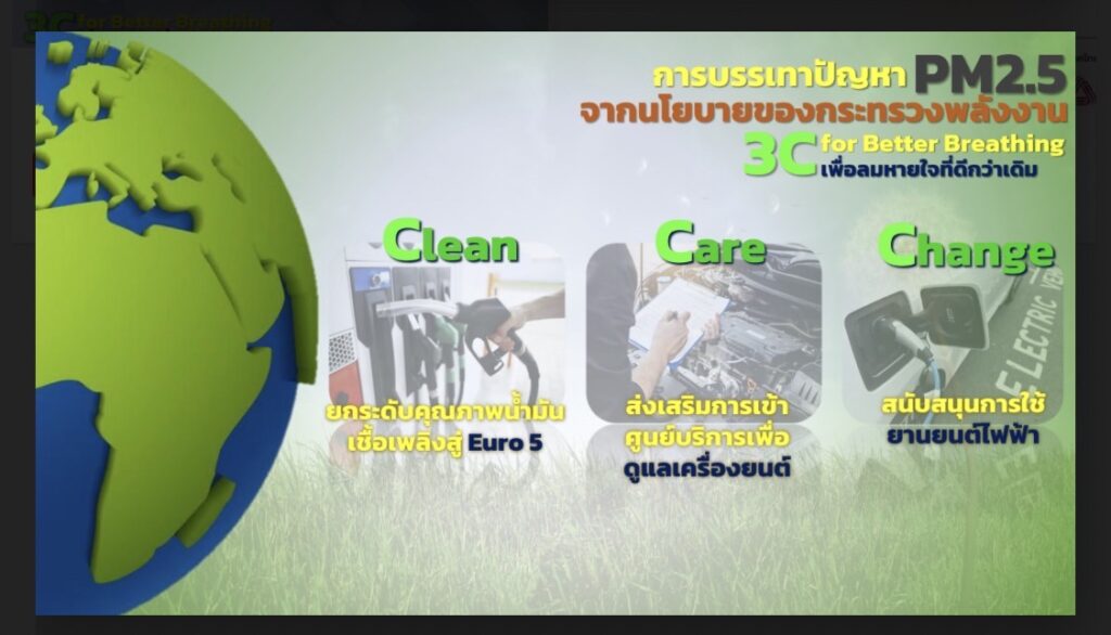 ในส่วนของกระทรวงพลังงานเดินหน้าผลักดัน การบังคับใช้มาตรฐานน้ำมันดีเซล จากมาตรฐานน้ำมัน EURO 4 เปลี่ยนเป็น EURO 5 เริ่มบังคับใช้ 1 มกราคม 2567 ยอมรับว่าน้ำมัน EURO 5 ลดปัญหากำมะถันได้ 4-5 เท่า ส่งผลให้ลดปริมาณฝุ่นได้ถึงร้อยละ 20 บอร์ด EV ยังเดินหน้าผลักดันการใช้รถบรรทุกไฟฟ้า เพื่อลดต้นทุนการขนส่งและปัญหาฝุ่น หวังส่งเสริมให้มีรถบรรทุกไฟฟ้าในระบบมากขึ้น