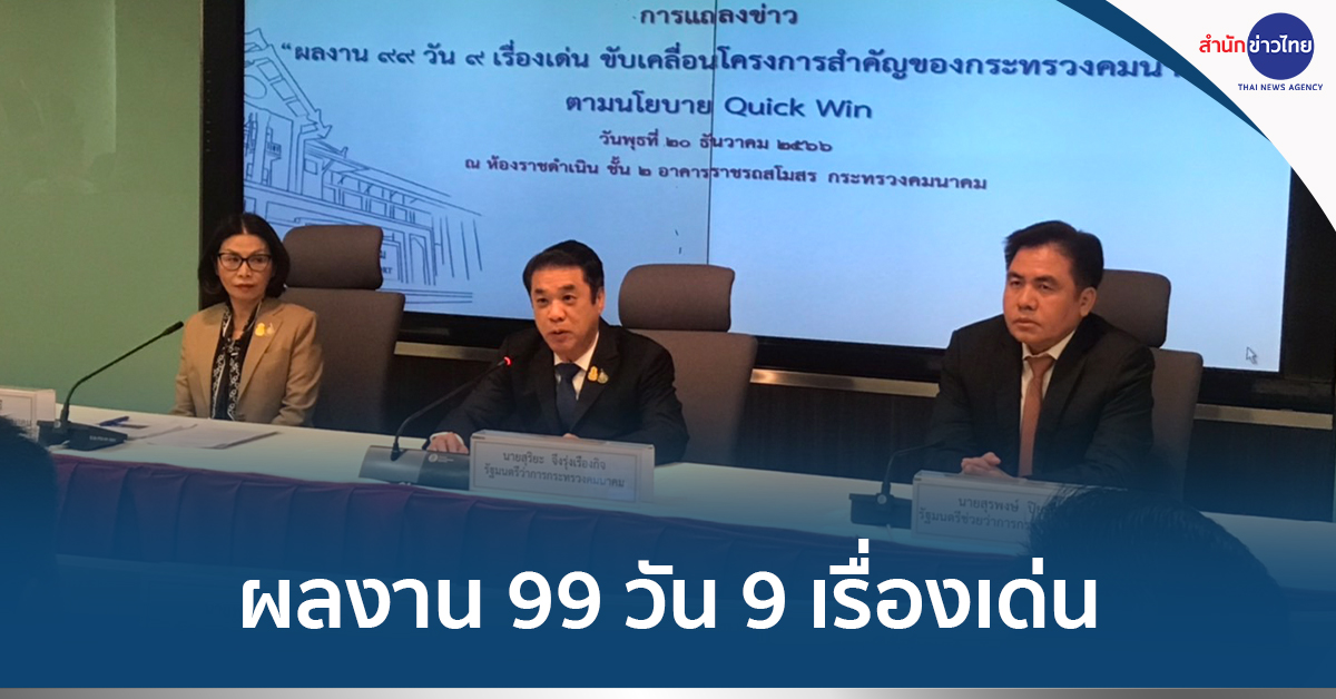 กรุงเทพฯ 20 ธ.ค. – “สุริยะ” โชว์ผลงาน 99 วัน 9 เรื่องเด่น ทั้งทางบก-น้ำ-ราง-อากาศ ชูนโยบายรถไฟฟ้า 20 บาทตลอดสายเป็นนโยบายที่ดี พร้อมเร่งสร้างมอเตอร์เวย์สายบางปะอิน-นครราชสีมา สายบางใหญ่-กาญจนบุรี และโครงการแลนด์บริดจ์เชื่อมอ่าวไทย-อันดามัน