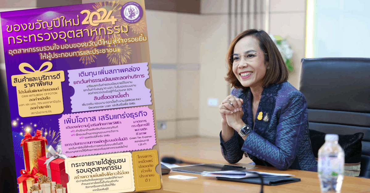 นางสาวพิมพ์ภัทรา วิชัยกุล รัฐมนตรีว่าการกระทรวงอุตสาหกรรม เปิดเผยว่า ตามที่นายเศรษฐา ทวีสิน นายกรัฐมนตรีและรัฐมนตรีว่าการกระทรวงการคลัง ได้ให้ทุกกระทรวงจัดเตรียมแผนงานและโครงการ เพื่อมอบเป็นของขวัญปีใหม่ พ.ศ. 2567 ให้กับประชาชน เพื่อช่วยเหลือในการลดค่าครองชีพช่วงเทศกาลสำคัญ เพื่อส่งความสุขให้กับประชาชน และลดค่าใช้จ่าย เพิ่มกำลังซื้อสินค้า อีกทั้งยังส่งเสริมการขายและเศรษฐกิจในภาพรวมของประเทศ กระทรวงอุตสาหกรรมจึงได้ดำเนินการรวบรวมโครงการ/กิจกรรม ที่สามารถให้การช่วยเหลือและเป็นประโยชน์ต่อประชาชนและผู้ประกอบการ เพื่อมอบให้เป็นของขวัญปีใหม่ พ.ศ. 2567 โดยแบ่งเป็น 4 ด้าน ประกอบด้วย