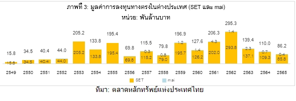 ตลาดหลักทรัพย์แห่งประเทศไทย (ตลท.) เผยแพร่ SET Note โดยระบุว่า ปี 2565 เศรษฐกิจโลกเผชิญกับสถานการณ์ตึงเครียดและความไม่แน่นอน เช่น สงครามรัสเซีย-ยูเครน ส่งกระทบต่อการฟื้นตัวของเศรษฐกิจโลกที่ยังคงเปราะบางจากสถานการณ์การแพร่ระบาดของ COVID-19 จากฐานข้อมูลการลงทุนต่างประเทศและรายได้จากต่างประเทศของบริษัทจดทะเบียนในตลาดหลักทรัพย์ไทย รวม 810 บริษัท พบว่าภาพรวมปี 2565 บริษัทจดทะเบียนใน SET และ mai (บริษัทจดทะเบียนฯ) เปิดเผยข้อมูลการลงทุนในต่างประเทศ 287 บริษัท จากบริษัทจดทะเบียนฯ ทั้งหมด 810 บริษัท หรือคิดเป็น 35% ของจำนวนบริษัทจดทะเบียนฯ ทั้งหมด โดยบริษัทจดทะเบียนเหล่านี้มีมูลค่าหลักทรัพย์ตามราคาตลาด (Market Capitalization) รวมสูงถึง 14 ล้านล้านบาท