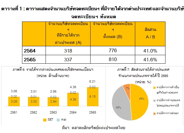 ในปี 2565 บริษัทจดทะเบียนฯ มีรายได้จากต่างประเทศ 6.21 ล้านล้านบาท หรือคิดเป็น 32% ของรายได้รวมทั้งหมดของบริษัทจดทะเบียนฯ โดยรายได้ส่วนใหญ่มาจากบริษัทจดทะเบียนใน SET มูลค่า 6.18 ล้านล้านบาท และรายได้จากต่างประเทศของบริษัทจดทะเบียนใน mai มูลค่า 1.9 หมื่นล้านบาท ส่วนใหญ่มาจากรายได้ของบริษัทจดทะเบียนฯ ที่ดำเนินธุรกิจในต่างประเทศ มีสัดส่วนสูงถึง 49% ของรายได้จากต่างประเทศทั้งหมด