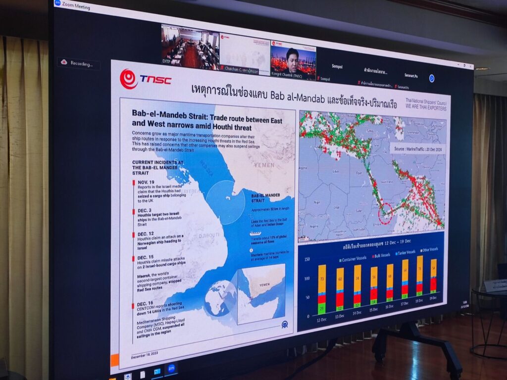 อนึ่ง ข้อมูลระหว่างวันที่ 12-19 ธันวาคม 2566 พบว่ามีการเดินเรือสินค้าตู้คอนเทนเนอร์ เรือสินค้าเทกองแห้ง เรือสินค้าเทกองเหลว และเรือประเภทอื่นๆ ผ่านพื้นที่ดังกล่าวระหว่าง 106-124 ลำ โดยในวันที่ 19 ธันวาคม 2566 ยังมีเรือขนส่งตู้คอนเทนเนอร์ผ่านพื้นที่จำนวน 9 ลำ แต่หากสถานการณ์ยืดเยื้อและสายเรือปรับเส้นทางไปยังแหลม Good Hope จะส่งผลกระทบต่อผู้ส่งออกของไทยและ Global Supply Chain ในที่สุด