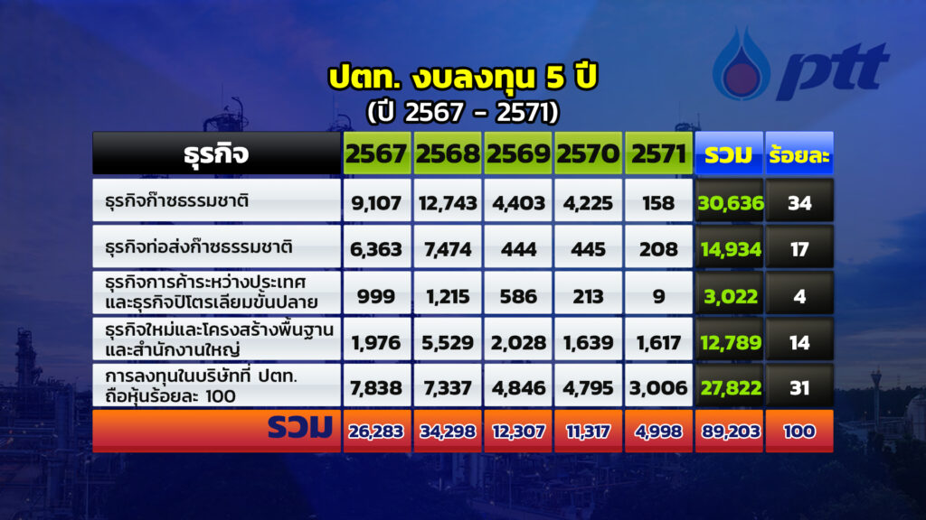 นายอรรถพล ฤกษ์พิบูลย์ ประธานเจ้าหน้าที่บริหารและกรรมการผู้จัดการใหญ่ บมจ.ปตท. (PTT) แจ้งตลาดหลักทรัพย์ฯว่า ที่ประชุมคณะกรรมการ ปตท. เมื่อวันที่ 21 ธ.ค.2566 ได้มีมติอนุมัติงบลงทุน 5 ปี (ปี 2567 – 2571) ของ ปตท. และบริษัทที่ ปตท. ถือหุ้นร้อยละ 100 วงเงินรวม 89,203 ล้านบาท โดย มีการลงทุนในธุรกิจหลัก (Core Business) เพื่อสร้างการเติบโตอย่างยั่งยืน รวมถึงสร้างความมั่นคงทางพลังงานให้กับประเทศซึ่งคิดเป็นสัดส่วนของงบการลงทุน 5 ปี ประมาณร้อยละ 51 โดยมีโครงการหลัก อาทิ โรงแยกก๊าซธรรมชาติหน่วยที่ 7 เพื่อทดแทนโรงแยกก๊าซธรรมชาติหน่วยที่ 1 และโรงแยกก๊าซธรรมชาติหน่วยที่ 8 รวมทั้งโครงการท่อส่งก๊าซฯ บางปะกง-โรงไฟฟ้าพระนครใต้ และ โครงการท่อส่งก๊าซธรรมชาติบนบกเส้นที่ 5 และเพื่อให้การลงทุนสอดคล้องกับวิสัยทัศน์ของ ปตท. “Powering life with future cnergy and beyond” นั้น ปตท. ยังมีการลงทุนในธุรกิจใหม่ผ่านบริษัทที่ ปตท. ถือหุ้นร้อยละ 100 อาทิ โครงการลงทุนในธุรกิจยานยนต์ไฟฟ้าครบวงจร เช่น โครงการ EVme ซึ่งให้บริการด้านดิจิทัลแพลตฟอร์มเพื่อการใช้รถยนต์ไฟฟ้าครบวงจร โครงการก่อสร้างโรงงานผลิตรถยนต์ไฟฟ้า Horizon Plus โครงการการลงทุนในธุรกิจโรงงานประกอบแบตเตอรี่ โดยใช้เทคโนโลยี Cell- To- Pack (CTP) รวมถึง โครงการพัฒนาท่าเรืออุตสาหกรรมมาบตาพุดระยะที่ 3 และ โครงการพัฒนาท่าเรือแหลมฉบังระยะที่ 3