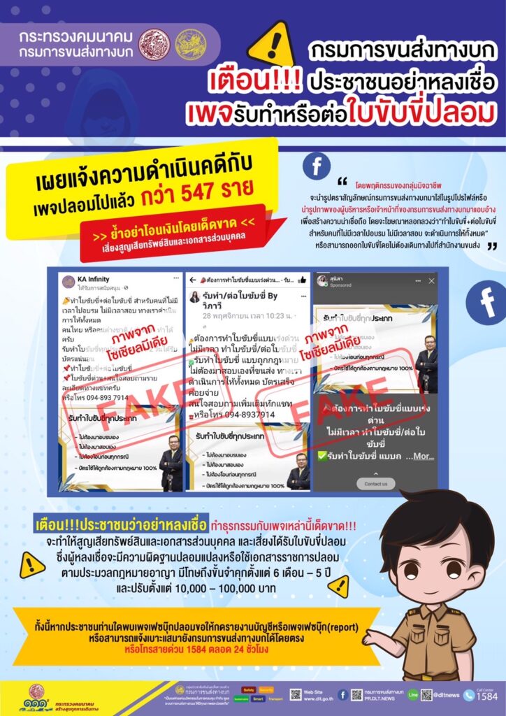 กรุงเทพ 22 ธ.ค.-กรมการขนส่งทางบก เตือนประชาชนอย่าหลงเชื่อเพจรับทำหรือต่อใบขับขี่ปลอม ย้ำอย่าโอนเงินโดยเด็ดขาด เสี่ยงสูญเสียทรัพย์สินและเอกสารส่วนบุคคล เผยแจ้งความดำเนินคดีกับเพจปลอมไปแล้วกว่า 547 ราย