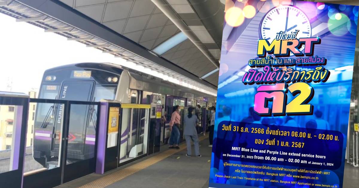 รฟม.แจ้งว่าเตรียมมอบของขวัญส่งความสุขเนื่องในเทศกาลปีใหม่ 2567 ให้แก่ประชาชน โดย รฟม.ได้ร่วมกับ บมจ.ทางด่วนและรถไฟฟ้ากรุงเทพ (BEM) บริษัท อีสเทิร์น บางกอกโมโนเรล จำกัด (EBM) และบริษัท นอร์ทเทิร์น บางกอกโมโนเรล จำกัด (NBM) ผู้ให้บริการเดินรถไฟฟ้าทั้ง 4 สาย สายเฉลิมรัชมงคล (MRT สายสีน้ำเงิน) รถไฟฟ้ามหานคร สายฉลองรัชธรรม (MRT สายสีม่วง) รถไฟฟ้ามหานคร สายสีเหลือง (MRT สายสีเหลือง) และรถไฟฟ้ามหานคร สายสีชมพู (MRT สายสีชมพู) ขยายเวลาสิ้นสุดการให้บริการรถไฟฟ้า MRT สายสีม่วง สายสีน้ำเงิน สายสีเหลือง และสายสีชมพู ในคืนวันอาทิตย์ที่ 31 ธันวาคม 2566 ถึงเวลา 02.00 น. ของวันที่ 1 มกราคม 2567 เพื่ออำนวยความสะดวกให้แก่ผู้โดยสารที่เดินทางในช่วงเทศกาลปีใหม่ตามแนวเส้นทางรถไฟฟ้า และเป็นการส่งเสริมให้ประชาชนเดินทางด้วยระบบขนส่งสาธารณะ