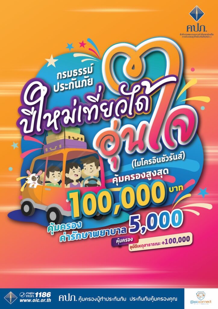 นายชูฉัตร ประมูลผล เลขาธิการ คปภ. พร้อมด้วย ผู้บริหารสภาธุรกิจประกันภัย สมาคมประกันชีวิตไทย สมาคมประกันวินาศภัยไทย สมาคมตัวแทนประกันชีวิตและที่ปรึกษาทางการเงิน สมาคมนายหน้าประกันไทย และหน่วยงานที่เกี่ยวข้อง เปิดตัว “กรมธรรม์ประกันภัยกลุ่มปีใหม่ เที่ยวไทยได้อุ่นใจ (ไมโครอินชัวรันส์) คุ้มครองอุบัติเหตุระหว่างการเดินทาง ทั้งเสียชีวิตวงเงิน 1 แสนบาท และคุ้มครองค่ารักษพยาบาลบาดเจ็บจากอุบัติเหตุ 5,000 บาท ระยะเวลาคคุ้มครอง 30 วัน