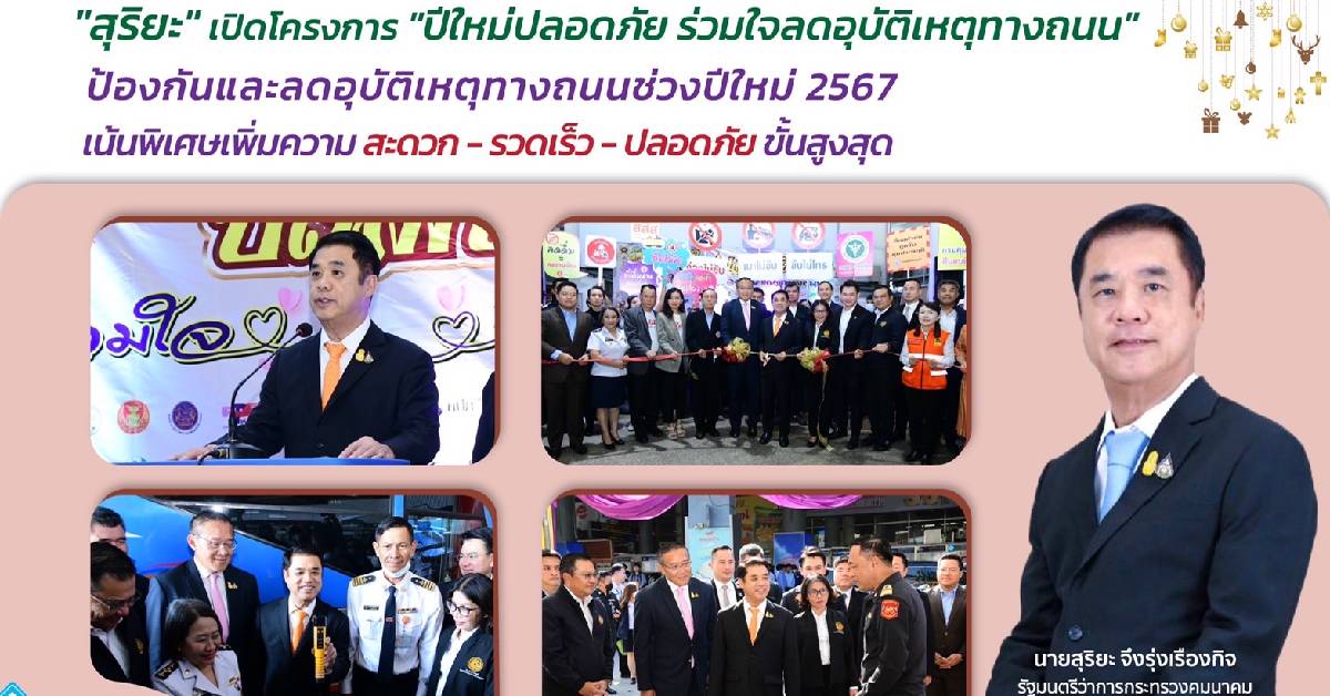 นายสุริยะ จึงรุ่งเรืองกิจ รัฐมนตรีว่าการกระทรวงคมนาคม เป็นประธานเปิดโครงการ “ปีใหม่ปลอดภัย ร่วมใจลดอุบัติเหตุทางถนน” พร้อมด้วย นางมนพร เจริญศรี รัฐมนตรีช่วยว่าการกระทรวงคมนาคม ณ สถานีขนส่งผู้โดยสารกรุงเทพ (จตุจักร)