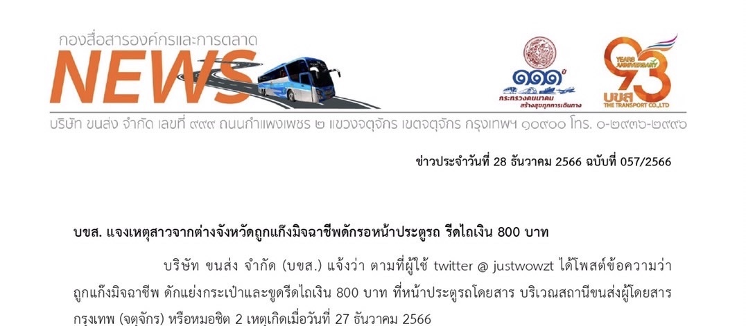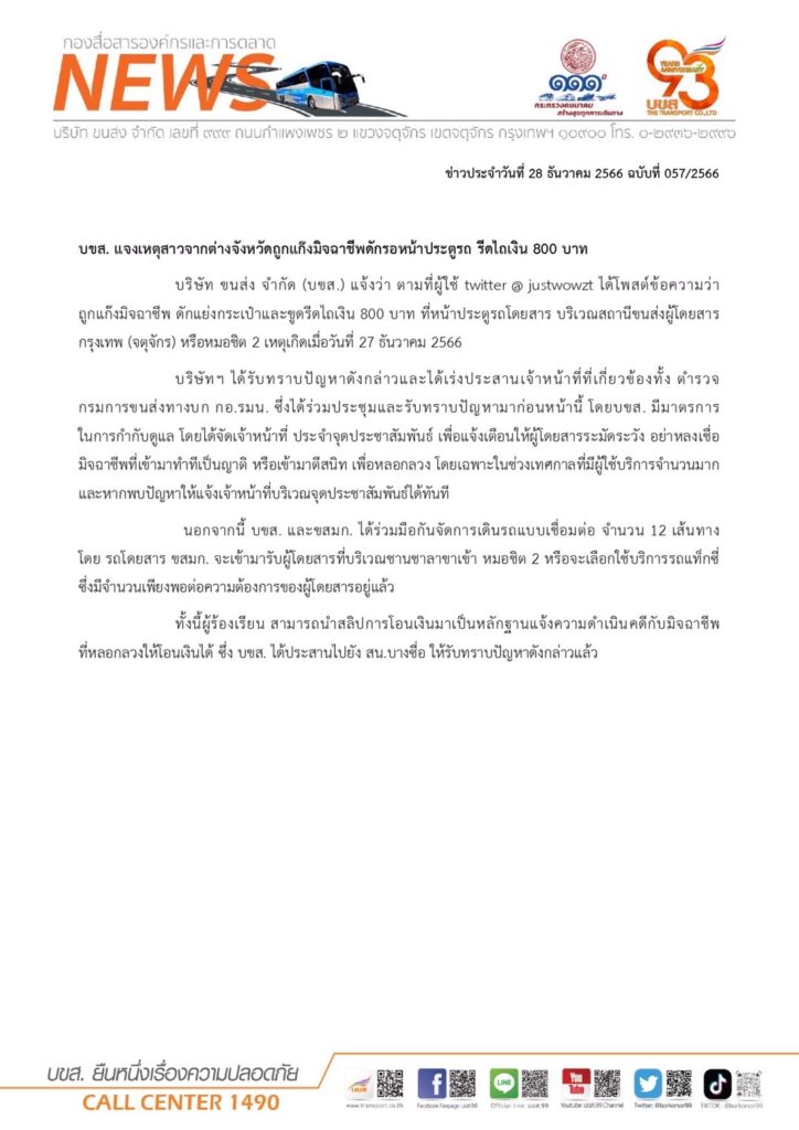 บริษัท ขนส่ง จำกัด (บขส.) แจ้งว่า ตามที่ผู้ใช้ twitter @ justwowzt ได้โพสต์ข้อความว่า ถูกแก๊งมิจฉาชีพ ดักแย่งกระเป๋าและขูดรีดไถเงิน 800 บาท ที่หน้าประตูรถโดยสาร บริเวณสถานีขนส่งผู้โดยสารกรุงเทพ (จตุจักร) หรือหมอชิต 2 เหตุเกิดเมื่อวันที่ 27 ธันวาคม 2566