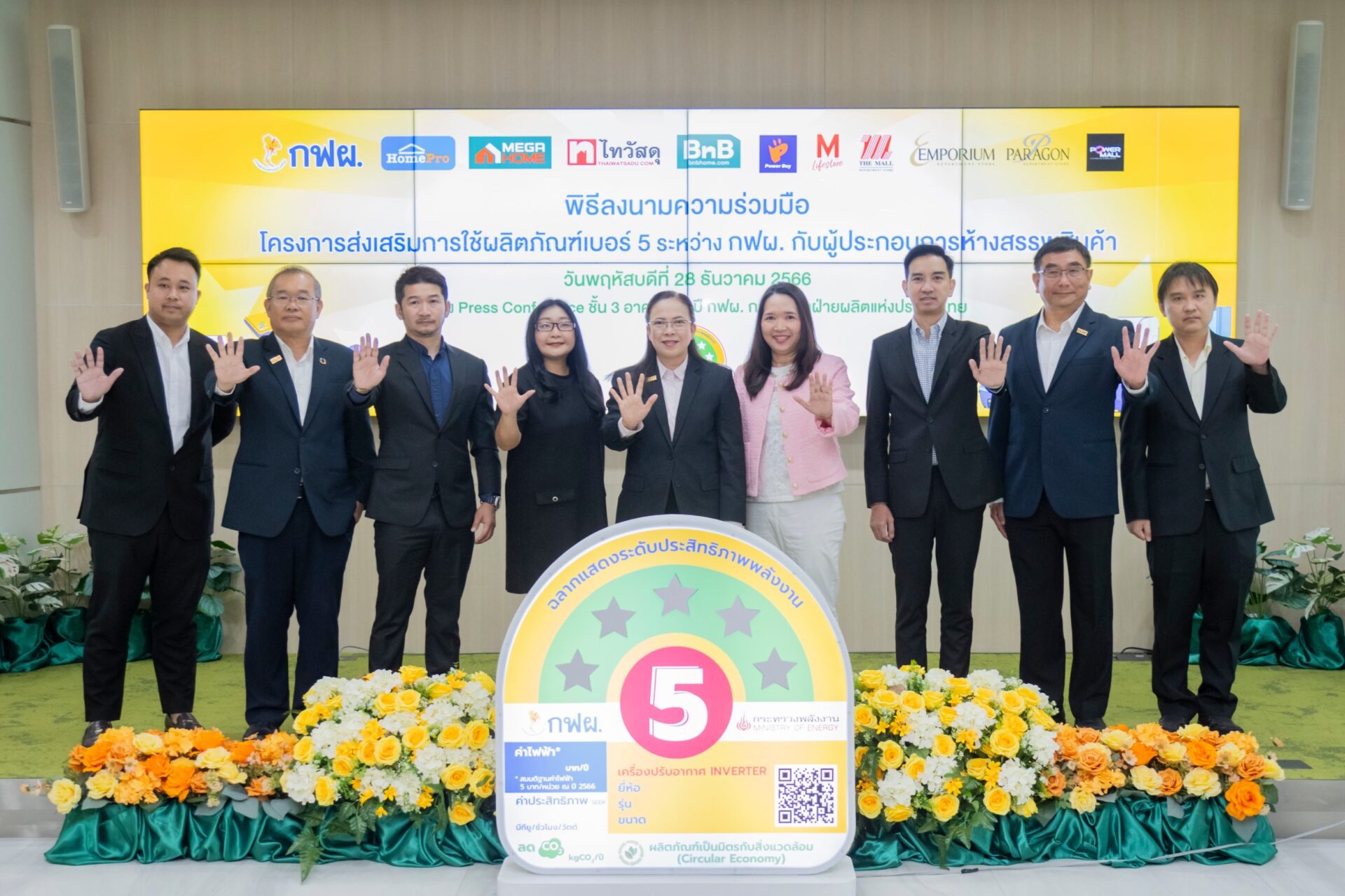 ดร.จิราพร ศิริคำ รองผู้ว่าการธุรกิจเกี่ยวเนื่อง รักษาการผู้ว่าการการไฟฟ้าฝ่ายผลิตแห่งประเทศไทย (กฟผ.) แถลงข่าวเปิดตัว “กิจกรรม กฟผ. มอบความสุขต้อนรับปีใหม่ 2567” พร้อมลงนามความร่วมมือโครงการส่งเสริมการใช้ผลิตภัณฑ์เบอร์ 5 กับ 8 ผู้ประกอบการห้างสรรพสินค้า