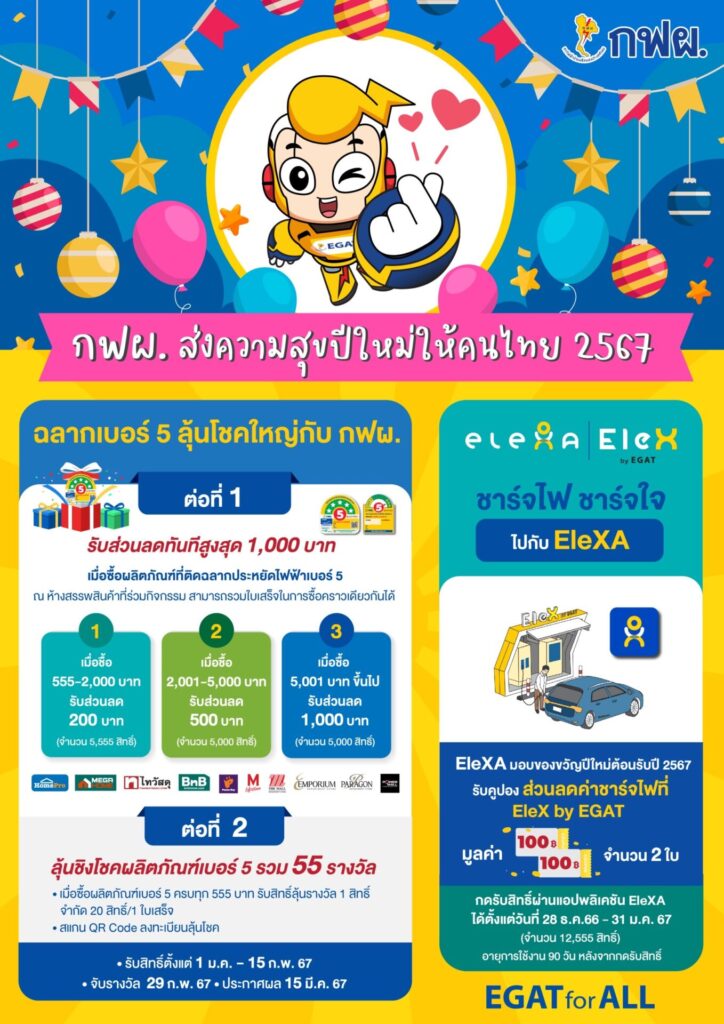 ทั้งนี้ ตามนโยบายของกระทรวงพลังงาน ที่ต้องการสร้างความสุขให้กับคนไทยเป็นของขวัญช่วงส่งท้ายปีเก่า ต้อนรับปีใหม่ ประกอบกับ กฟผ. จะครบรอบ 55 ปี ในปี 2567 กฟผ. จึงจัด “กิจกรรม กฟผ. มอบความสุขต้อนรับปีใหม่ 2567” ด้วย 2 แคมเปญใหญ่ คือ “ฉลากเบอร์ 5 ลุ้นโชคใหญ่กับ กฟผ.” และ “ชาร์จใจ ชาร์จไฟ ไปกับEleXA” โดยแคมเปญ “ฉลากเบอร์ 5 ลุ้นโชคใหญ่กับ กฟผ.” จะมอบโชคถึง 2 ต่อ ต่อที่ 1 มอบส่วนลดมูลค่าสูงสุด 1,000 บาท เมื่อซื้ออุปกรณ์ไฟฟ้าที่ติดฉลากประหยัดไฟฟ้าเบอร์ 5 จำนวน 15,555 สิทธิ์ จำกัด 1 คน 1 สิทธิ์ และสามารถนำใบเสร็จจากการซื้ออุปกรณ์ไฟฟ้าดังกล่าวที่มีมูลค่า 555 บาทขึ้นไป ลงทะเบียนลุ้นรับรางวัลต่อที่ 2 โดยทุก 555 บาท ได้รับ 1 สิทธิ์ จำกัด 20 สิทธิ์ ต่อ 1 ใบเสร็จ ลุ้นรางวัลรวม 55 รางวัล