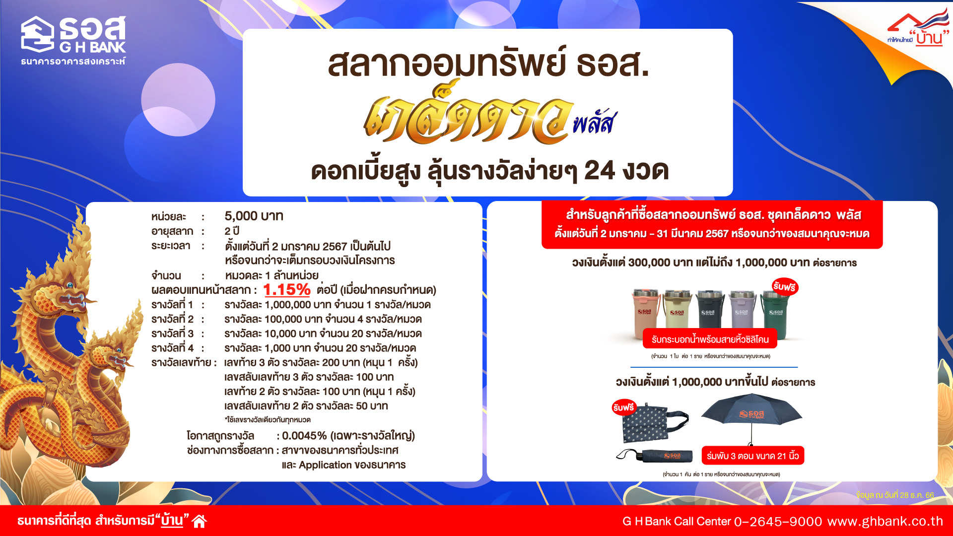 ธนาคารอาคารสงเคราะห์ (ธอส.) มอบโชคต้อนรับปีใหม่ 2567 ให้กับผู้รักการออมที่ต้องการทางเลือกในการออมเงินที่ให้ผลตอบแทนหน้าสลากเพิ่มสูงขึ้น มีโอกาสถูกรางวัลใหญ่ กับ “สลากออมทรัพย์ ชุดเกล็ดดาว พลัส” หน่วยละ 5,000 บาท อายุสลาก 2 ปี ซื้อสลากตั้งแต่วันที่ 2 มกราคม 2567 เป็นต้นไป รับผลตอบแทนหน้าสลากสูงถึง 1.15% ต่อปี เมื่อฝากครบกำหนดจะได้รับเงินต้นพร้อมดอกเบี้ยรวม หน่วยละ 5,115 บาท และมีสิทธิ์ลุ้นรางวัลทุกเดือนรวม 24 ครั้ง โดยรางวัลที่ 1 มูลค่ารางวัลละ 1,000,000 บาท จำนวน 1 รางวัล/หมวด รางวัลที่ 2 รางวัลละ 100,000 บาท จำนวน 4 รางวัล/หมวด รางวัลที่ 3 รางวัลละ 10,000 บาท จำนวน 20 รางวัล/หมวด รางวัลที่ 4 รางวัลละ 1,000 บาท จำนวน 20รางวัล/หมวด คิดเป็นโอกาสในการถูกรางวัลใหญ่สูงถึง 0.0045% โดยรางวัลเลขท้าย 3 ตัว รางวัลละ 200 บาท