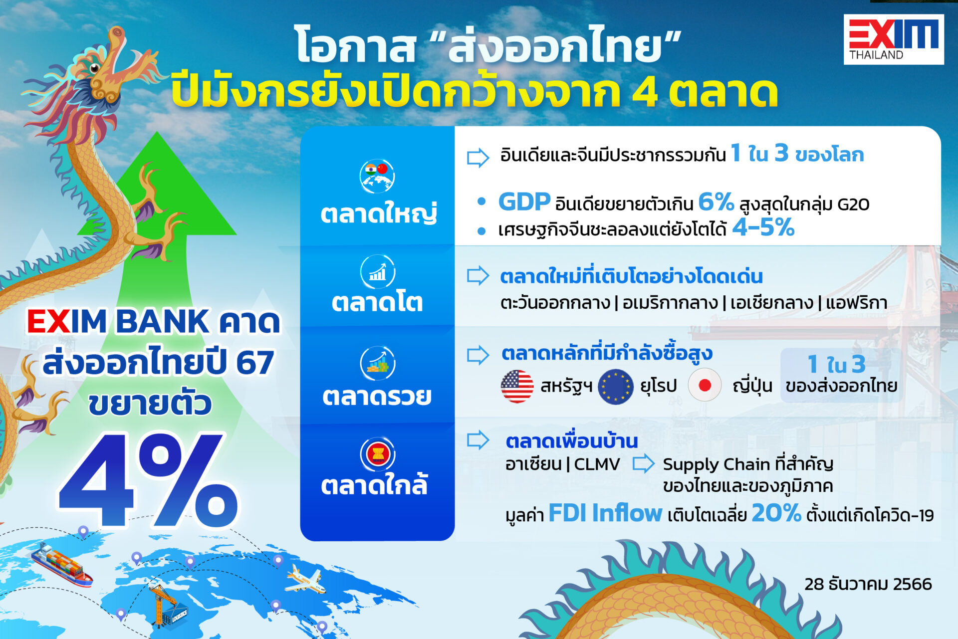 กรุงเทพฯ 28 ธ.ค.- EXIM BANK ชี้โอกาส “ตลาดส่งออก” ปีมังกร โตตามตลาดโลกฟื้นตัว หนุนการส่งออกไทยปี 2567 ขยายตัวร้อยละ 4