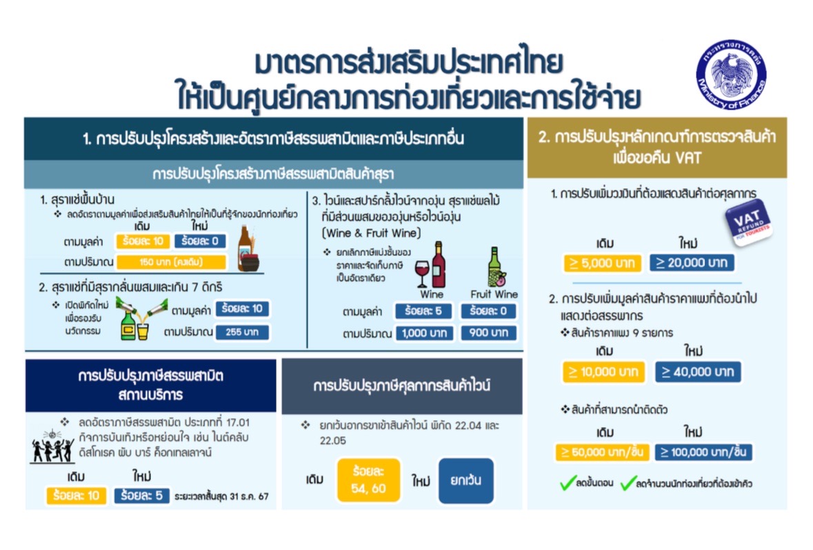 การปรับปรุงอัตราภาษีสรรพสามิตสินค้าสุราและสถานบริการ เพื่อเป็นการสนับสนุนมาตรการส่งเสริมประเทศไทยให้เป็นศูนย์กลางการท่องเที่ยว และยกระดับอุตสาหกรรมสุราพื้นบ้าน สร้างมูลค่าเพิ่มให้กับสินค้าเกษตรไทย จึงได้เสนอให้มีการปรับปรุงอัตราภาษีสินค้าสุราแช่พื้นบ้าน ไวน์ ไวน์ผลไม้ และสุราแช่ชนิดอื่นๆ เช่น ปรับปรุงอัตราภาษีสุราแช่พื้นบ้าน (อุ กระแช่ สาโท สุราแช่พื้นบ้านอื่น และสุราแช่ที่ใช้วัตถุดิบเป็นข้าวที่มีแรงแอลกอฮอล์ไม่เกิน 7 ดีกรี) กำหนดอัตราภาษีตามมูลค่าร้อยละ 0 และอัตราภาษีตามปริมาณ 150 บาท ต่อปริมาณหนึ่งลิตรแห่งแอลกอฮอล์บริสุทธิ์ (ลดลงจากอัตราภาษีตามมูลค่าร้อยละ 10 และอัตราภาษีตามปริมาณ 150 บาท ต่อปริมาณหนึ่งลิตรแห่งแอลกอฮอล์บริสุทธิ์) และมีการปรับปรุงอัตราภาษีไวน์และไวน์ผลไม้ โดยยกเลิกการจัดเก็บภาษีจากการแบ่งชั้นของราคา (Price Tier) และกำหนดให้มีการจัดเก็บภาษีเป็นอัตราเดียว (Unitary Rate) ที่มีความเรียบง่ายและสอดคล้องกับมาตรฐานสากล