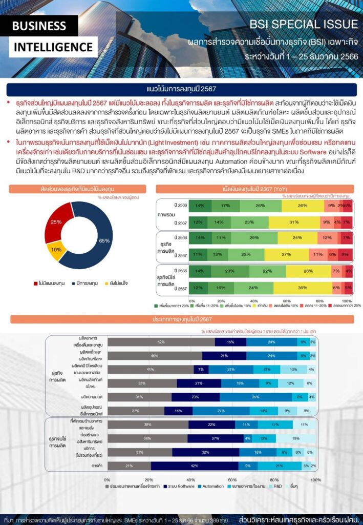 ธนาคารแห่งประเทศไทย เผยผลสำรวจความเชื่อมั่นทางธุรกิจเฉพาะกิจ (BSI Special) เดือนธันวาคม 2566 โดยธุรกิจส่วนใหญ่มีแผนลงทุนในปี 2567 แต่มีแนวโน้มชะลอลง ทั้งในธุรกิจการผลิต และธุรกิจที่มิใช่การผลิต ในภาพรวมธุรกิจเน้นการลงทุนที่ใช้เม็ดเงินไม่มากนัก (Light Investment) เช่น ภาคการผลิตส่วนใหญ่ลงทุนเพื่อซ่อมแซม หรือทดแทนเครื่องจักรเก่า เช่นเดียวกับภาคบริการที่เน้นซ่อมแซม ขณะที่ ธุรกิจการค้าที่มิใช่กลุ่มสินค้าอุปโภคบริโภคเน้นลงทุนในระบบ Software