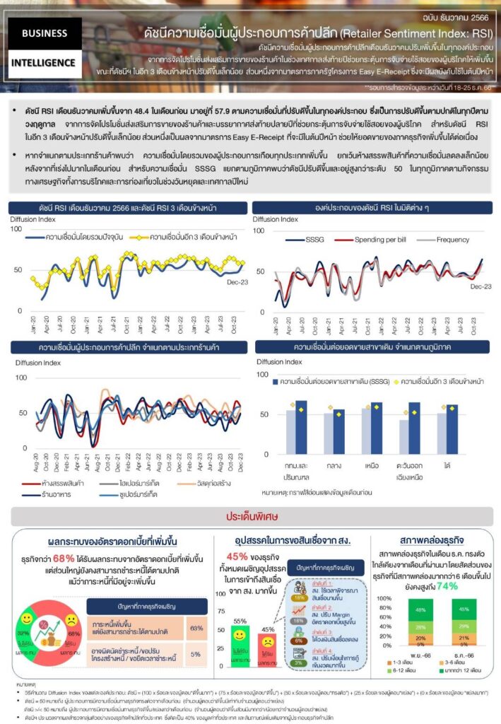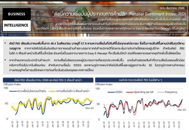 ขณะที่ผลสำรวจดัชนีความเชื่อมั่นผู้ประกอบการค้าปลีก (Retailer Sentiment Index: RSI) เดือนธันวาคม 2566 ซึ่งจัดทำร่วมกับสมาคมผู้ค้าปลีกไทย พบว่า ดัชนีความเชื่อมั่นผู้ประกอบการค้าปลีกเดือนธันวาคมปรับเพิ่มขึ้นในทุกองค์ประกอบ จากการจัดโปรโมชั่นส่งเสริมการขายของร้านค้าในช่วงเทศกาลส่งท้ายปีซึ่งช่วยกระตุ้นการจับจ่ายใช้สอยของผู้บริโภคให้เพิ่มขึ้น ขณะที่ดัชนีฯ ในอีก 3 เดือนข้างหน้าปรับดีขึ้นเล็กน้อย ส่วนหนึ่งจากมาตรการภาครัฐโครงการ Easy E-Receipt ซึ่งจะมีผลบังคับใช้ในต้นปีหน้า . – 517 – สำนักข่าวไทย