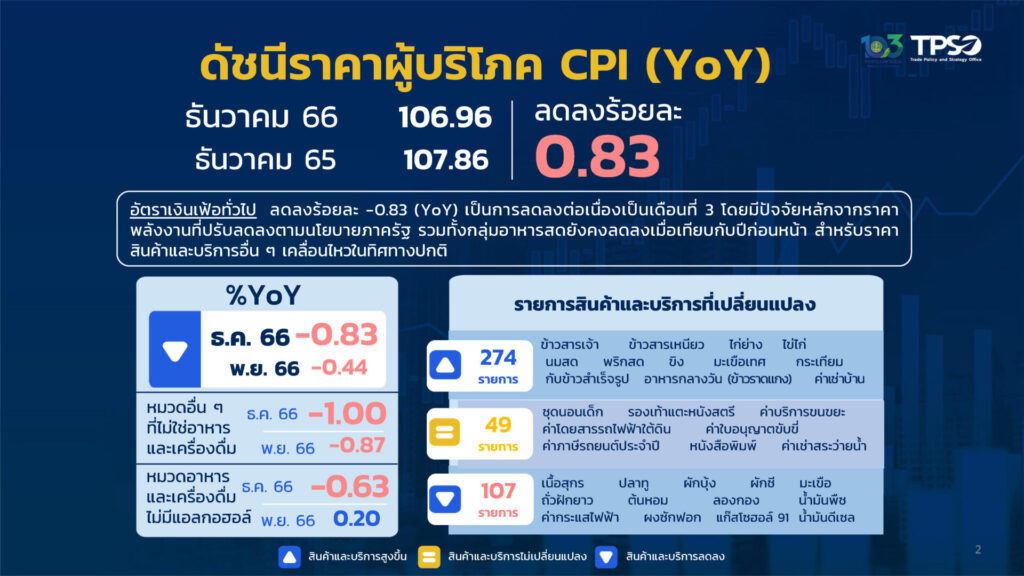 นายพูนพงษ์ นัยนาภากรณ์ ผู้อำนวยการสำนักงานนโยบายและยุทธศาสตร์การค้า เผยว่า ดัชนีราคาผู้บริโภคของไทย เดือนธันวาคม 2566 เท่ากับ 106.96 เมื่อเทียบกับเดือนธันวาคม 2565 ซึ่งเท่ากับ 107.86 ส่งผลให้อัตราเงินเฟ้อทั่วไปลดลงร้อยละ 0.83 ลดลงต่อเนื่องเป็นเดือนที่ 3 และต่ำสุดในรอบ 24 เดือนนับตั้งแต่เดือน มี.ค.64 แม้ว่าเงินเฟ้อจะลดติดต่อกัน 3 เดือนมาแล้ว ไม่ถือเป็นการเข้าสู่เงินฝืด เนื่องจากสินค้าส่วนใหญ่ลดลงตามกระแสนโยบายลดค่าครองชีพของรัฐบาล โดยปัจจัยสำคัญมาจากการลดลงของราคาสินค้าในกลุ่มพลังงาน ได้แก่ น้ำมันเชื้อเพลิง และค่ากระแสไฟฟ้า ตามนโยบายลดภาระค่าครองชีพด้านพลังงานของรัฐบาล รวมทั้งเนื้อสัตว์และเครื่องประกอบอาหารที่ราคาลดลงต่อเนื่อง นอกจากนี้ ผักสดราคาลดลงค่อนข้างมาก สำหรับสินค้าและบริการอื่น ๆ ราคาเคลื่อนไหวในทิศทางปกติ ส่วนเงินเฟ้อพื้นฐาน เมื่อหักอาหารสดและพลังงานออก สูงขึ้นร้อยละ 0.58