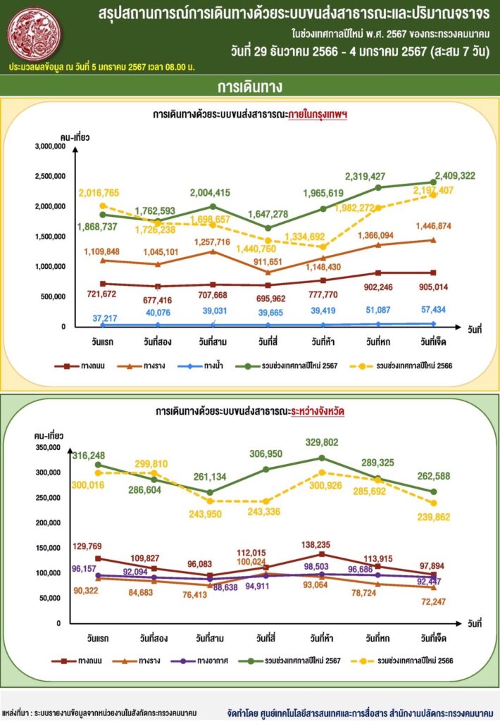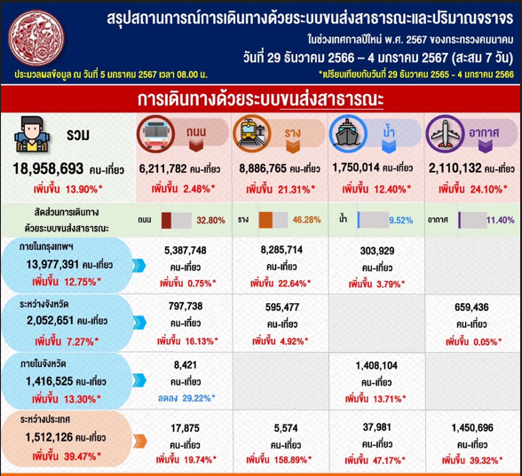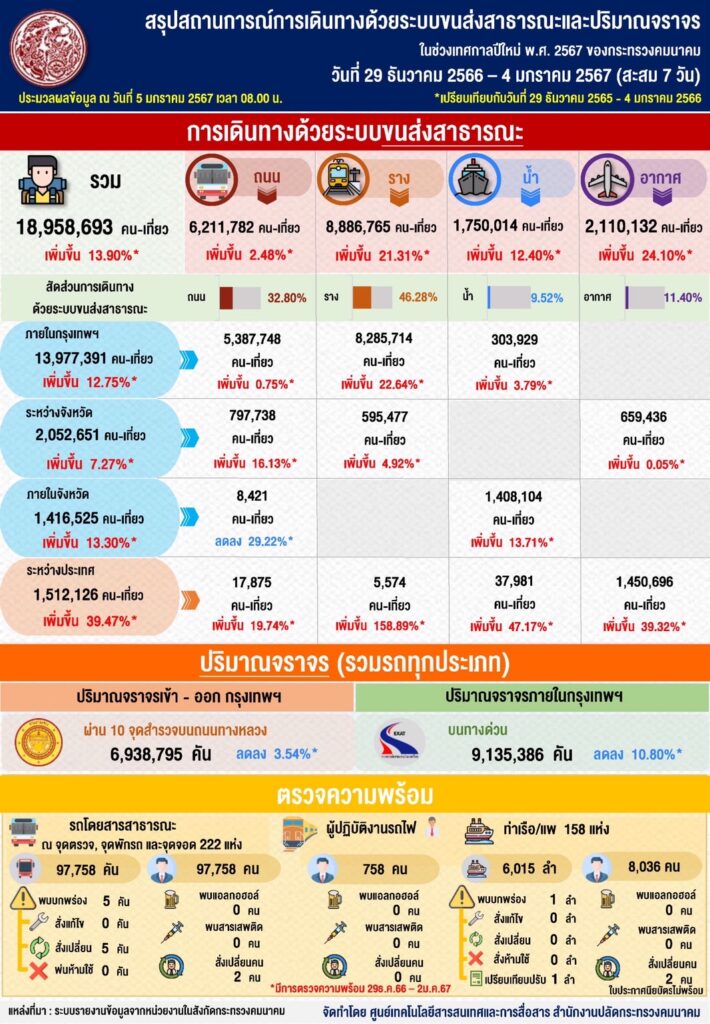 กรุงเทพ 5 ม.ค.-กระทรวงคมนาคม สรุปรายงานข้อมูลการเดินทางและอุบัติเหตุช่วงเทศกาลปีใหม่ 2567 ระหว่างวันที่ 29 ธันวาคม 2566 – 4 มกราคม 2567 (สะสม 7 วัน) ณ วันที่ 5 มกราคม 2567 โดยมีการเดินทางด้วยระบบขนส่งสาธารณะรวม 18,958,693 คน-เที่ยว