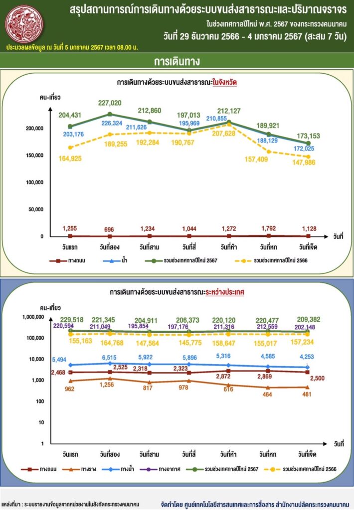ศูนย์ปฏิบัติการความปลอดภัยคมนาคม ได้สรุปรายงานข้อมูลการเดินทางและอุบัติเหตุช่วงเทศกาลปีใหม่ 2567 ระหว่างวันที่ 29 ธันวาคม 2566 - 4 มกราคม 2567 (สะสม 7 วัน) ประมวลผลข้อมูล ณ วันที่ 5 มกราคม 2567 เวลา 08.00 น. จากระบบการเดินทางและระบบ TRAMS พบว่า