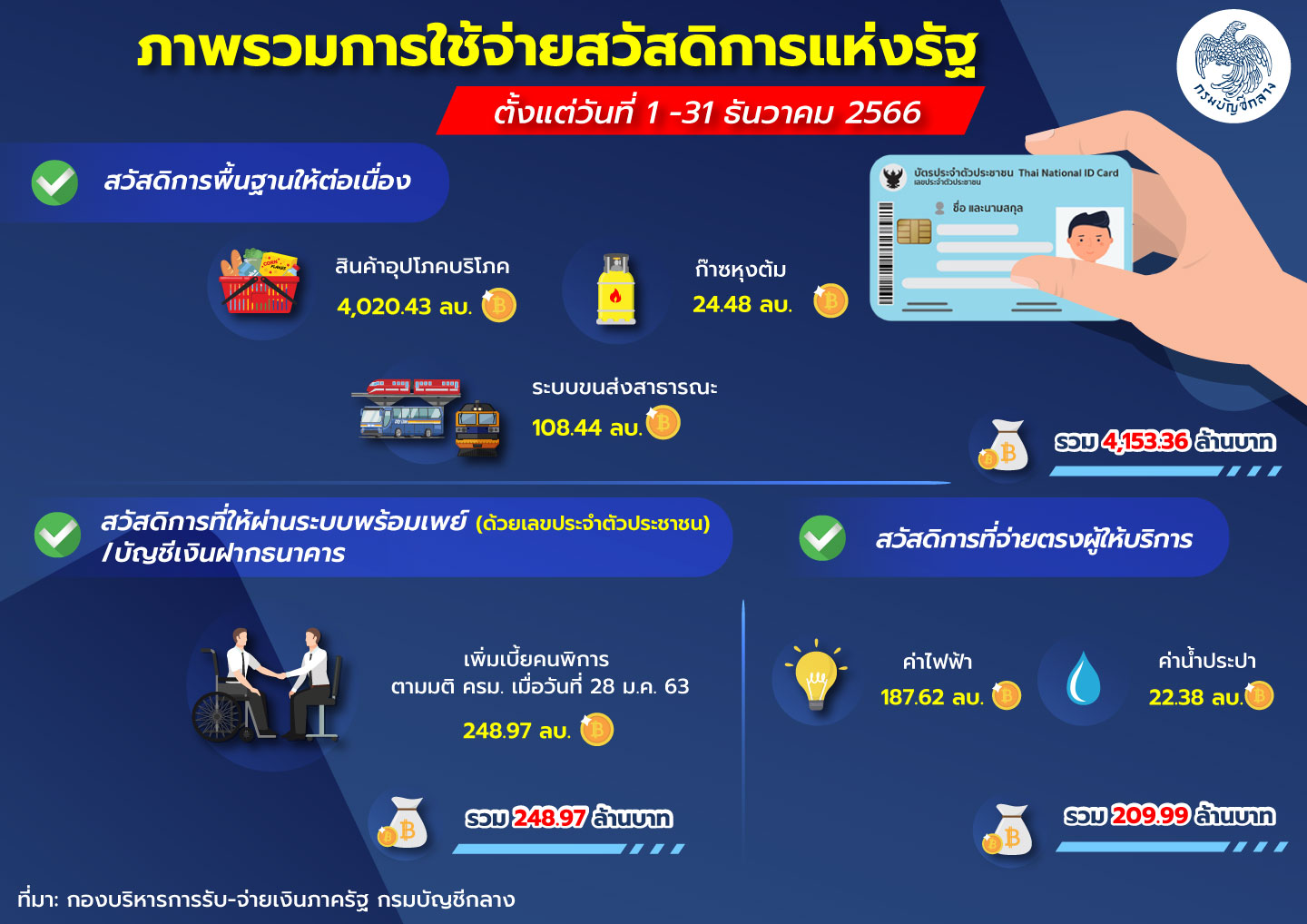 กรมบัญชีกลางขอรายงานผลการจ่ายเงินสวัสดิการแห่งรัฐ ข้อมูลตั้งแต่วันที่ 1- 31 ธันวาคม 2566 ดังนี้