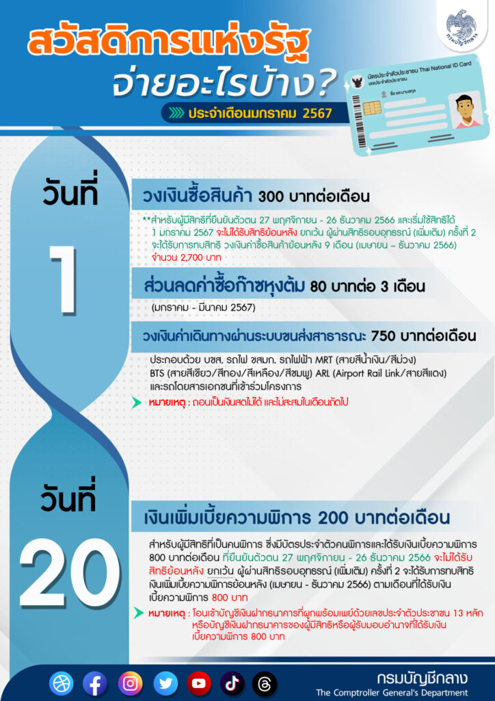 นางสาวทิวาพร ผาสุข รองอธิบดีกรมบัญชีกลาง ในฐานะโฆษกกรมบัญชีกลาง เปิดเผยว่า โครงการลงทะเบียนเพื่อสวัสดิการแห่งรัฐ ปี 2565 ผู้มีสิทธิสามารถใช้สิทธิผ่านบัตรประจำตัวประชาชนแบบสมาร์ทการ์ด ในเดือนมกราคม 2567 ได้รับสิทธิ ดังนี้ รอบวันที่ 1 มกราคม 2567 (เป็นวงเงินสิทธิไม่สามารถถอนเป็นเงินสดได้ และไม่สะสมในเดือนถัดไป) วงเงินซื้อสินค้า 300 บาทต่อคนต่อเดือน