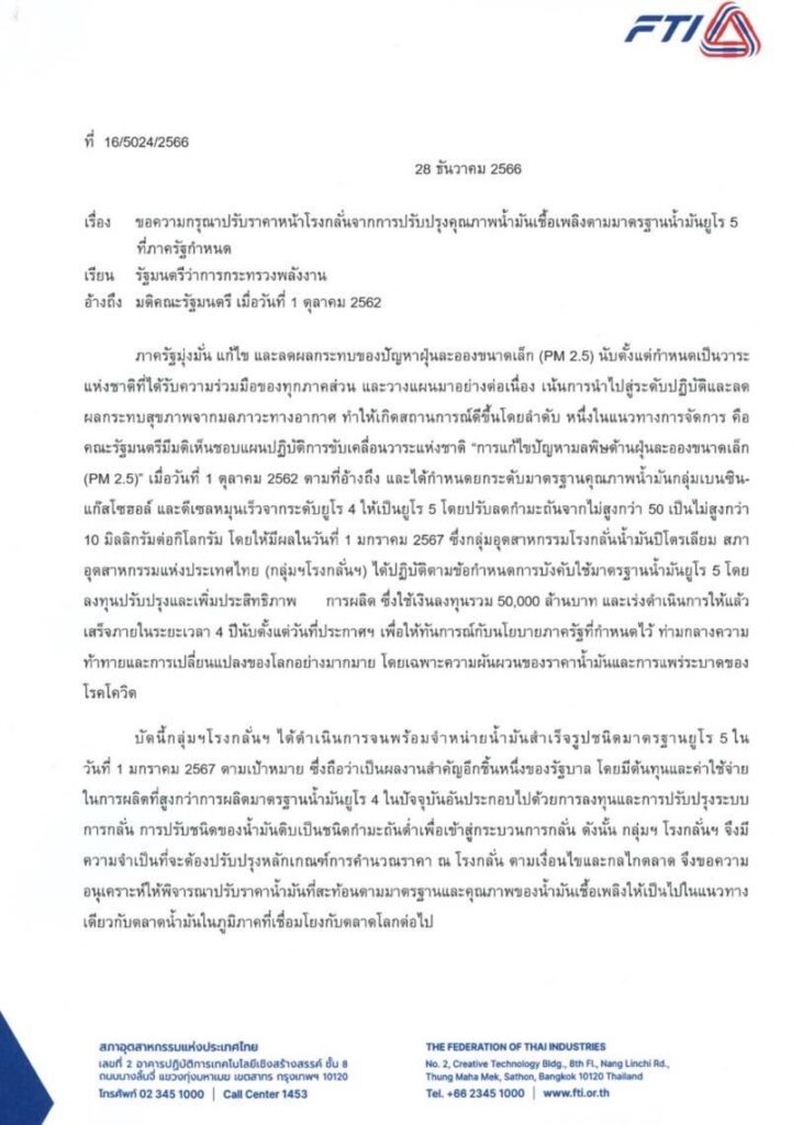 ผู้สื่อข่าว รายงาน ว่าเมื่อวันที่ 28 ธ.ค. 66 นายเกรียงไกร เชียรนุกุล ประธานสภาอุดสาหกรรมแห่งประเทศไทย (ส.อ.ท. ) ได้ทำหนังสือ ถึง นาย พีระพันธุ์ สาลีรัฐวิภาค รองนายกรัฐมนตรีและรัฐมนตรีว่าการกระทรวงพลังงาน เรื่องความกรุณาปรับราคาหน้าโรงกลั่นจากการปรับปรุงคุณภาพน้ำมันเชื้อเพลิงตามมาตรฐานน้ำมันยูโร 5 ซึ่งมีผลบังคับใช้เป็นมาตรฐานบังคับของประเทศตั้งแต่เมื่อวันที่ 1 ม.ค. 67 เป็นการปรับปรุงคุณภาพตาม มติคณะรัฐมนตรี เมื่อวันที่ 1 ตุลาคม 2562 ซึ่งเป็นหนึ่งในแผนผนปฏิบัติการขับเคลื่อนวาระแห่งชาติ “การแก้ไขปัญหามลพิษด้านฝุ่นละอองขนาดเล็ก(PM 2.5)’ กำหนดยกระดับมาตรฐานคุณภาพน้ำมันกลุ่มเบนชิน-แก๊สโซฮอล์ และดีเซลหมุนเร็วจากระดับยูโร 4 ให้เป็นยูโร 5 โดยปรับลดกำมะถันจากไม่สูงกว่า 50 เป็นไม่สูงกว่า10 มิลลิกรัมต่อกิโลกรัม ซึ่งทุกโรงกลั่นน้ำมัน ได้มีการลงทุนปรับปรุงคุณภาพน้ำมันรวม 5 หมื่นล้านบาท
