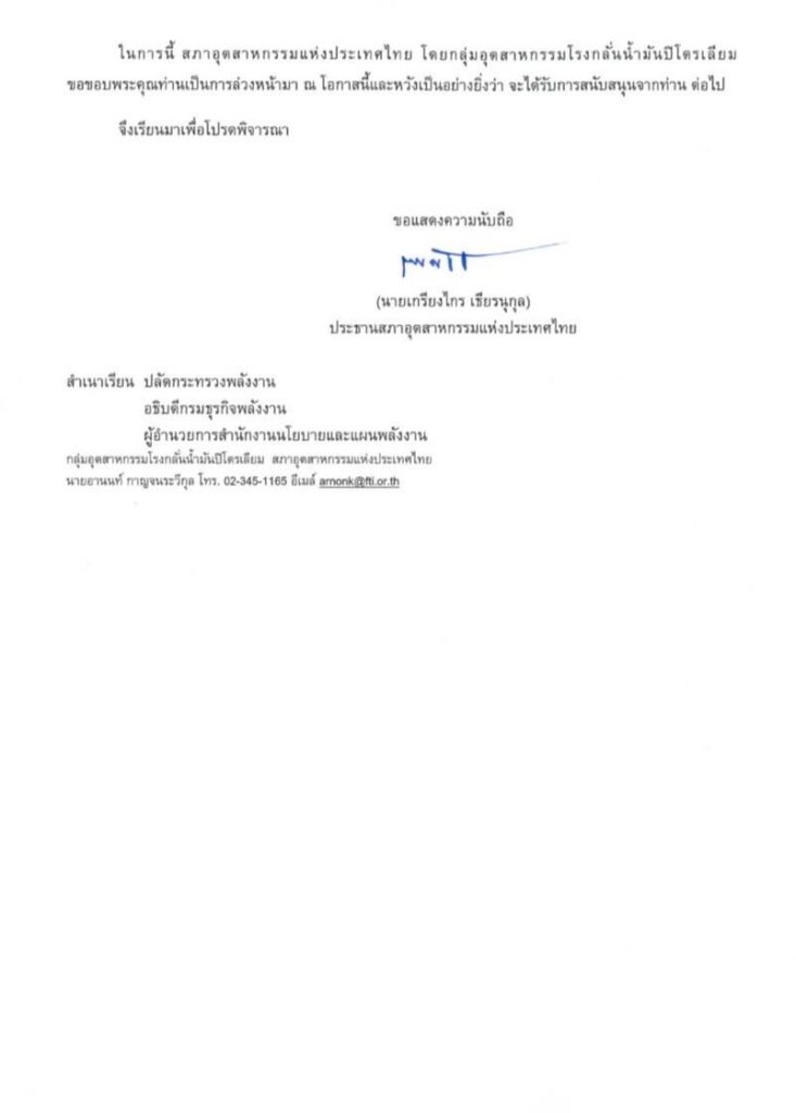 ประธาน ส.อ.ท.ระบุทุกโรงกลั่นฯได้ลงทุนปรับปรุงคุณภาพน้ำมันเป็นยูโร 5 ให้เสร็จภายในระยะเวลา 4 ปีนับตั้งแต่วันที่ประกาศฯ เพื่อให้ทันการณ์กับนโยบายภาครัฐที่กำหนดไว้ ท่มกลางความท้าทายและการเปลี่ยนแปลงของโลกอย่างมากมาย โดยเฉพาะความผันผวนของราคาน้ำมันและการแพร่ระบาดของโรคโควิด ซึ่งถือว่าเป็นผลงานสำคัญอีกชิ้นหนึ่งของรัฐบาล โดยมีตันทุนและด่ใช้จ่ายในการผลิตที่สูงกว่าการผลิตมาตรฐานน้ำมันยูโร 4 ในปัจจุบันอันประกอบไปด้วยการลงทุนและการปรับปรุงระบบการกลั่น การปรับชนิดของน้ำมันดิบเป็นชนิดกำมะถันต่ำเพื่อเข้าสู่กระบวนการกลั่น ดังนั้น กลุ่มฯ โรงกลั่นฯ จึงมี ความจำเป็นที่จะต้องปรับปรุงหลักเกณฑ์การคำนวณราคา ณ โรงกลั่น ตามเงื่อนไขและกลไกดลาด จึงขอความอนุเคราะห์ให้พิจารณาปรับราคาน้ำมันที่สะท้อนตามมาตรฐานและคุณภาพของน้ำมันเชื้อเพลิงให้เป็นไปในแนวทางเดียวกับตลาดน้ำมันในภูมิภาคที่เชื่อมโยงกับตลาดโลกต่อไป