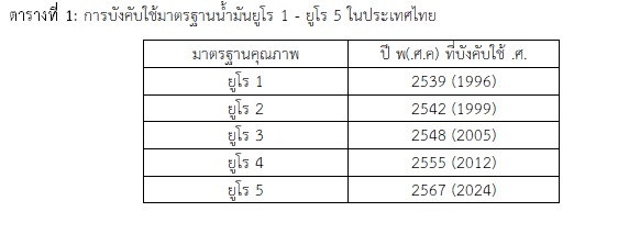 ประเทศไทยได้ยกระดับมาตรฐานน้ำมันมาโดยตลอด โดยเริ่มบังคับใช้มาตรฐานน้ำมันยูโร 1 ตั้งแต่ปี พ.ศ. 2539 และในปัจจุบันคือมาตรฐานน้ำมันยูโร 4 เมื่อปี พ.ศ. 2555 เป็นต้นมา ดังแสดงในตารางที่ 1 ประกอบกับภาครัฐมุ่งมั่น แก้ไข และลดผลกระทบของปัญหา PM2.5 นับตั้งแต่กำหนดเป็นวาระแห่งชาติที่ได้รับความร่วมมือจากทุกภาคส่วน