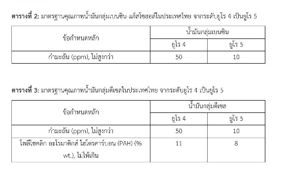 โดยเน้นการนำไปสู่ระดับปฏิบัติและลดผลกระทบต่อสุขภาพจากมลภาวะทางอากาศ และหนึ่งในแนวทางการจัดการ คือ คณะรัฐมนตรีมีมติเห็นชอบแผนปฏิบัติการขับเคลื่อนวาระแห่งชาติ “การแก้ไขปัญหามลพิษด้านฝุ่นละอองขนาดเล็ก (PM2.5)” เมื่อวันที่ 1 ตุลาคม พ.ศ. 2562 กำหนดมาตรการป้องกันและลดการเกิดมลพิษที่ต้นทาง รวมถึงแหล่งกำเนิดจากไอเสียของยานพาหนะ โดยกำหนดมาตรการยกระดับมาตรฐานการระบายมลพิษจากรถยนต์ใหม่จากระดับยูโร 4 ให้เป็นยูโร 5 และยกระดับมาตรฐานคุณภาพน้ำมันกลุ่มเบนซิน-แก๊สโซฮอล์ และดีเซลหมุนเร็วจากระดับยูโร 4 ให้เป็นยูโร 5 โดยปรับลดปริมาณกำมะถันจากไม่สูงกว่า 50 เป็นไม่สูงกว่า 10 มิลลิกรัมต่อกิโลกรัม (10 ppm) ให้มีผลบังคับใช้ตั้งแต่วันที่ 1 มกราคม 2567 เป็นต้นไป และน้ำมันกลุ่มดีเซลจะต้องยกระดับมาตรฐานคุณภาพเพิ่มเติม ลดปริมาณสารโพลีไซคลิก อะโรมาติกส์ ไฮโดรคาร์บอน (PAHs) จากไม่ให้เกิน 11% เป็นไม่ให้เกิน 8% ดังแสดงในตารางที่ 2 และ 3 ตามลำดับ