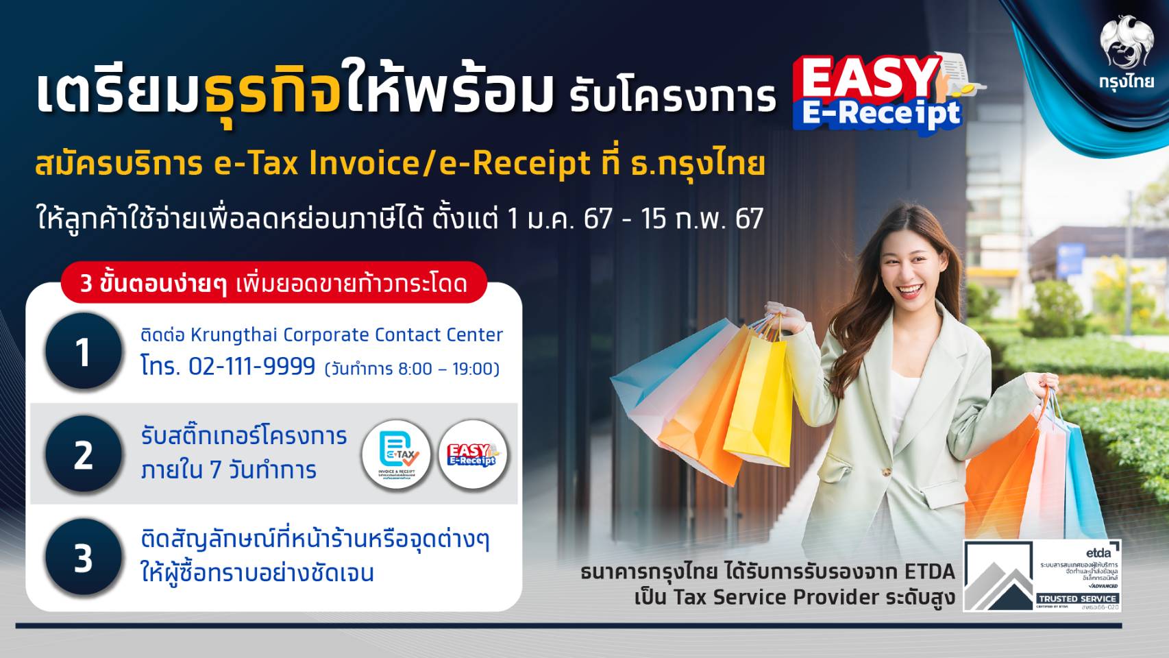 ผู้ประกอบการ SME และธุรกิจร้านค้าต่างๆ ที่สนใจสามารถสมัครบริการ Krungthai E-Tax / E-Receipt ตั้งแต่วันนี้ถึง 31 ธันวาคม 2567 จะได้รับอัตราค่าธรรมเนียมพิเศษ พร้อมรับตราสัญลักษณ์ E-TAX INVOICE & RECEIPT ตามที่กรมสรรพากรกำหนด เพื่อนำไปติดตั้ง ณ ร้านค้าและสถานประกอบการ นอกจากนี้ยังได้รับสติ๊กเกอร์โครงการ EASY E-Receipt เพื่อนำไปติดที่หน้าร้านหรือจุดรับชำระเงินต่างๆ เพื่อให้ผู้ซื้อสังเกตได้อย่างชัดเจน โดยติดต่อเจ้าหน้าที่ธนาคารผ่าน Krungthai Corporate Contact Center 02-111-9999 (ในวันและเวลาทำการ 8.00-19.00 น.) หรือศึกษารายละเอียดเพิ่มเติมได้ที่เว็บไซต์ https://krungthai.com/link/krungthai-e-tax-pr .-515 สำนักข่าวไทย