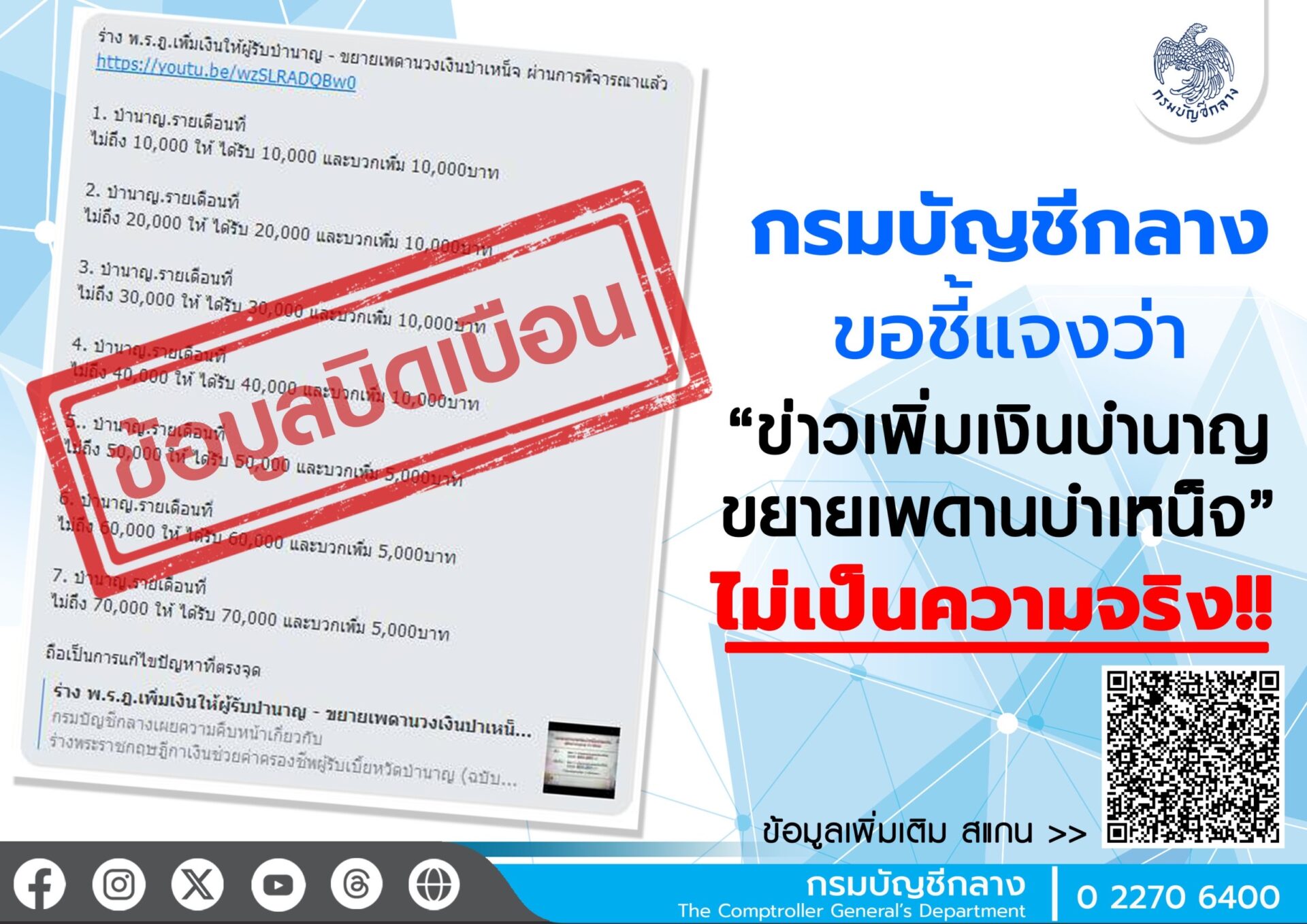 ขอชี้แจงว่า ปัจจุบันกรมบัญชีกลางยังไม่ได้รับนโยบายให้ลดหรือเพิ่ม รวมทั้งยกเลิกการจ่ายเงินบำนาญให้แก่ผู้รับบำนาญ ดังนั้น จึงขอเตือนให้ผู้ที่เกี่ยวข้องอย่าหลงเชื่อ อย่าแชร์ข้อความดังกล่าว และขอให้ติดตามข่าวสารจากช่องทางต่าง ๆ ของกรมบัญชีกลางเท่านั้น