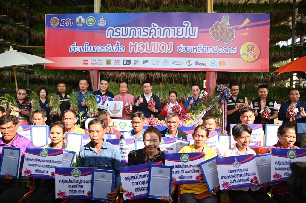 นายวัฒนศักย์ เสือเอี่ยม อธิบดีกรมการค้าภายใน เปิดเผยว่า กรมการค้าภายในรับนโยบายนายภูมิธรรม เวชยชัย รองนายกรัฐมนตรีและรัฐมนตรีว่าการกระทรวงพาณิชย์ ที่ได้สั่งการให้ดำเนินการช่วยเหลือเกษตรกรให้ขายผลผลิตได้ราคาดี ล่าสุดได้ทำการเชื่อมโยงการซื้อขายหอมแดงล่วงหน้าผ่านตลาดข้อตกลงมาตรฐานของกรม โดยประสานผู้ประกอบการเข้ารับซื้อหอมแดงจากเกษตรกร 3 อำเภอ ได้แก่ ยางชุมน้อย กันทรารมย์ ราษีไศล แบ่งเป็นกันทรารมย์ 5 กลุ่ม ยางชุมน้อย 3 กลุ่ม ราษีไศล 8 กลุ่ม มีการรับซื้อทั้งผลสดและแห้ง แบ่งเป็นหอมแดงสด 5,600 ตัน แห้ง 425 ตัน รวมทั้งหมด 6,875 ตัน
