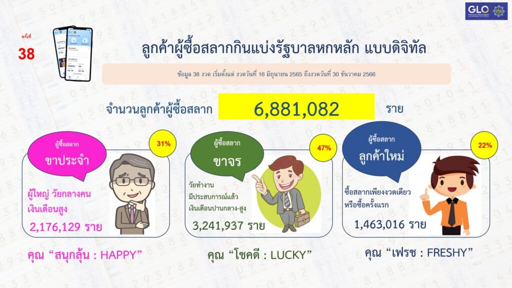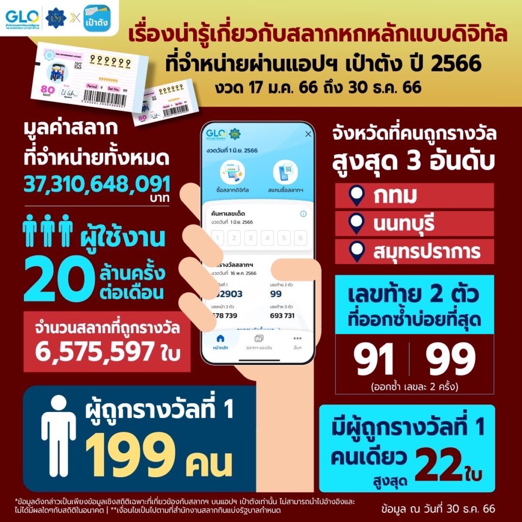 สำหรับการจำหน่ายสลากกินแบ่งรัฐบาลหกหลัก ทั้งแบบใบ 80 ล้านฉบับ และแบบดิจิทัล 22 ล้านฉบับ รวม 102 ล้านฉบับ มีผลตอบรับดีจากประชาชน ซื้อผ่านแอป “เป๋าตัง”สลากขายหมดก่อนวันออกรางวัลทุกงวด เนื่องจากผู้ซื้อสามารถเลือกซื้อเลขที่ต้องการได้ในราคา 80 บาททุกใบ และสะดวกในการรับเงินรางวัล ระบบตรวจผลรางวัลให้อัตโนมัติและโอนเงินรางวัลได้ภายใน 2 ชั่วโมง ทุกรางวัลรวมทั้งรางวัลที่ 1